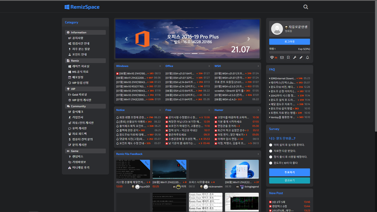 오늘 소개할 "MS 오피스 2021 포함된 윈도우 10"은 레미쯔님께서 커스터마이징 해주셨습니다. 2021. 08월 까지 업데이트 된 순정 윈도우10(21H1)에 오피스 2021 버전만 추가되었습니다. 거의 순정에 가깝기 때문에 큰 문제 없이 사용 할 수 있습니다. 레미쯔님께서 만드신 웹사이트에 들어가보면 최신버전의 윈도우 정보들을 확인 할 수 있고, 다운로드도 받을 수 있습니다.