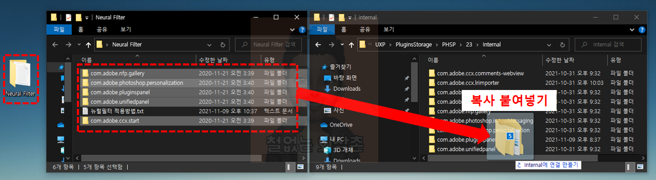 2️⃣ 다운로드 받은 파일의 압축을 해제하고 생성된 폴더로 들어가서 모든 폴더를 복사합니다. 그 다음 아래 폴더 경로로 이동 후 그대로 붙여넣기를 합니다. ( Neural Filter 압축해제하면 안에 폴더 경로 텍스트 파일이 있으니 참고하면되고, 경로는 2가지로 나누어지는데 두가지 경로를 파일 탐색기에 입력해보고 이동이 되는 경로를 사용 하시면 됩니다. )