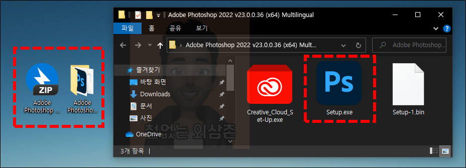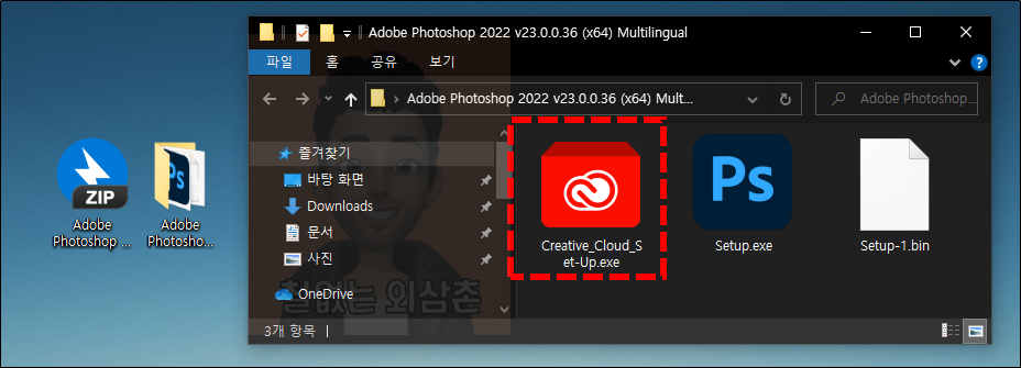 4️⃣ 설치 완료 후 바탕화면에 포토샵 아이콘이 생성 되었을건데, 절대 실행하지마시고 이번에는 다운로드 폴더에 있는 Creative_Cloud_set-Up.exe 파일을 실행합니다. ( 이미 다른 Adobe 제품 설치를 하면서 Creative Cloud 가 설치되어 있다면 " 4번 항목 ~ 9번 항목 "까지는 뛰어넘고 곧바로 프리미어를 실행하시면 됩니다. )