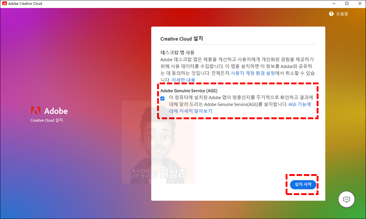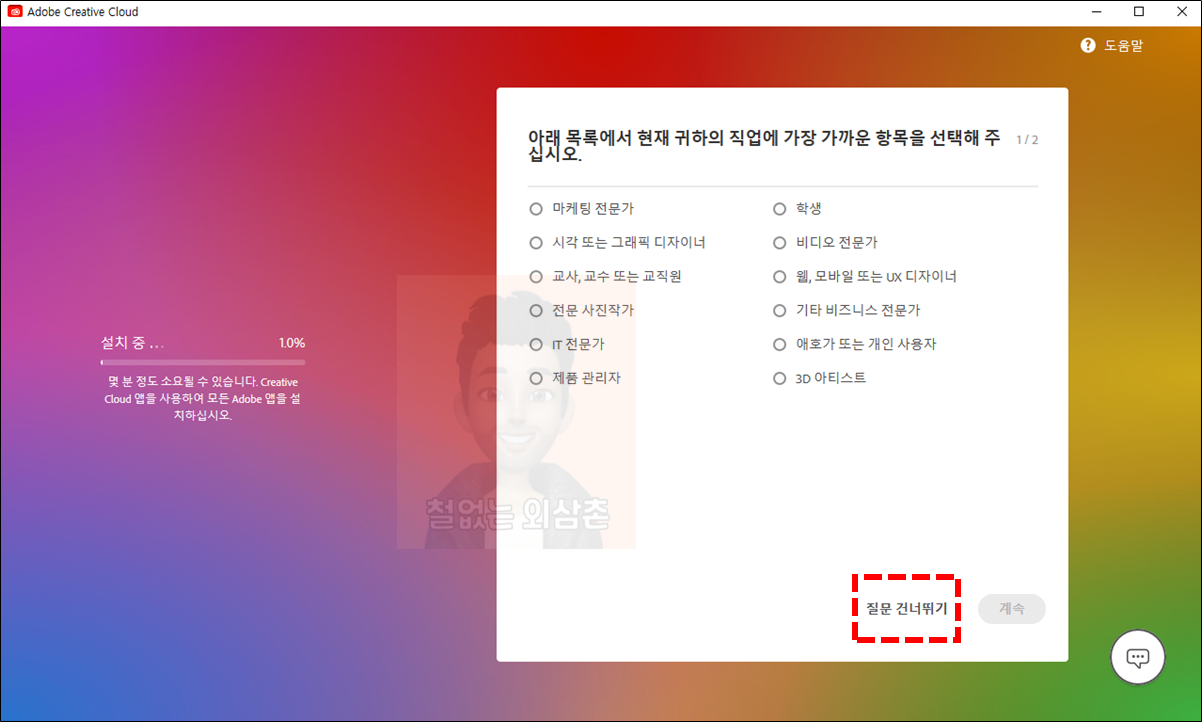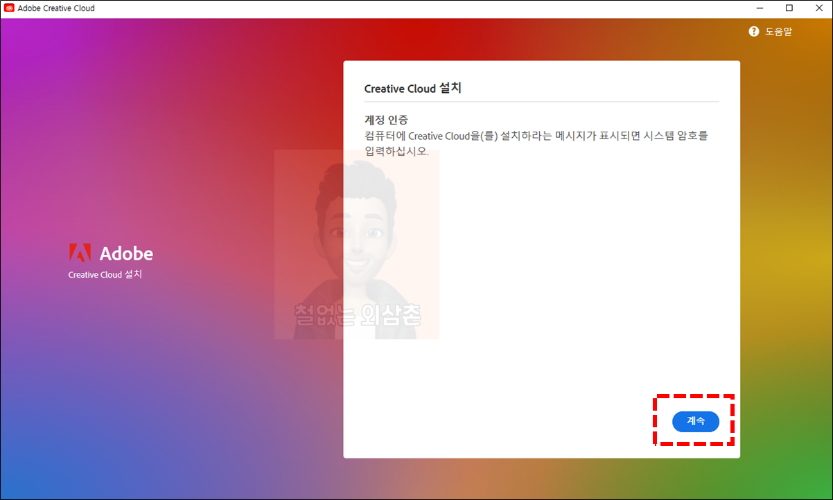 5️⃣ Adobe Creative Cloud 설치 팝업창이 뜨면 계속 버튼 클릭 후 로그인 화면에서 상단에 위치한 계정만들기 메뉴를 클릭 합니다.