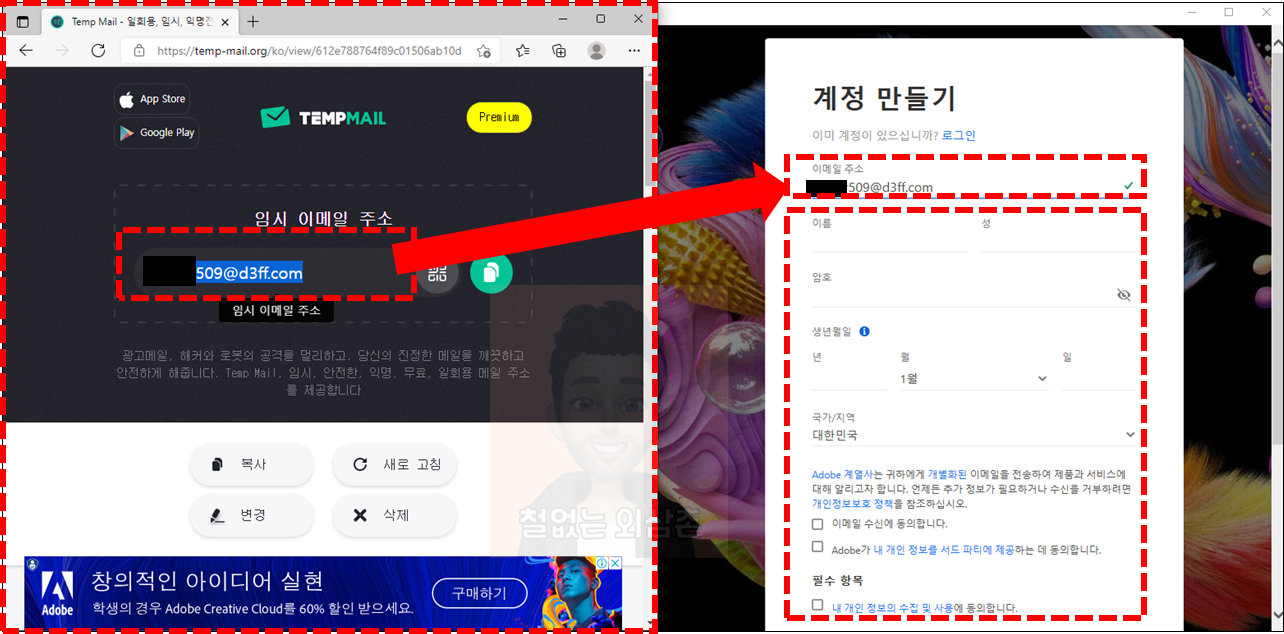 6️⃣ 아래 링크를 클릭해서 일회용 임시 이메일 만들기 사이트에서 임시로 생성된 메일을 복사 후 계정만들기 이메일 주소 입력 부분에 붙여넣기 해줍니다. 그리고 그 아래 개인정보들은 아무 정보나 입력 후 제일 하단에 위치한 계정만들기 버튼을 클릭 합니다.