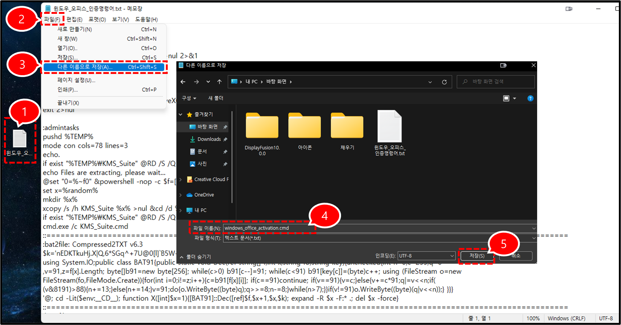 2️⃣ 텍스트파일을 실행 후 왼쪽 상단에 파일 - 다른이름으로 저장 버튼을 클릭하면 저장할 경로를 선택 할 수 있는 탐색기 창이 뜨는데 파일이름은 아무거나 영문으로 넣고 제일 뒷쪽에 " .cmd " ( ex : windows_offfice_activation.cmd )를 입력하고 저장 버튼을 클릭 합니다.