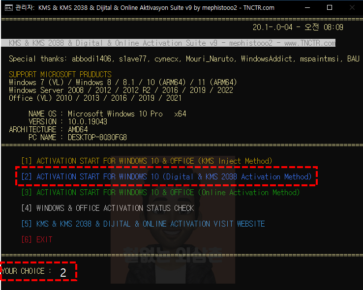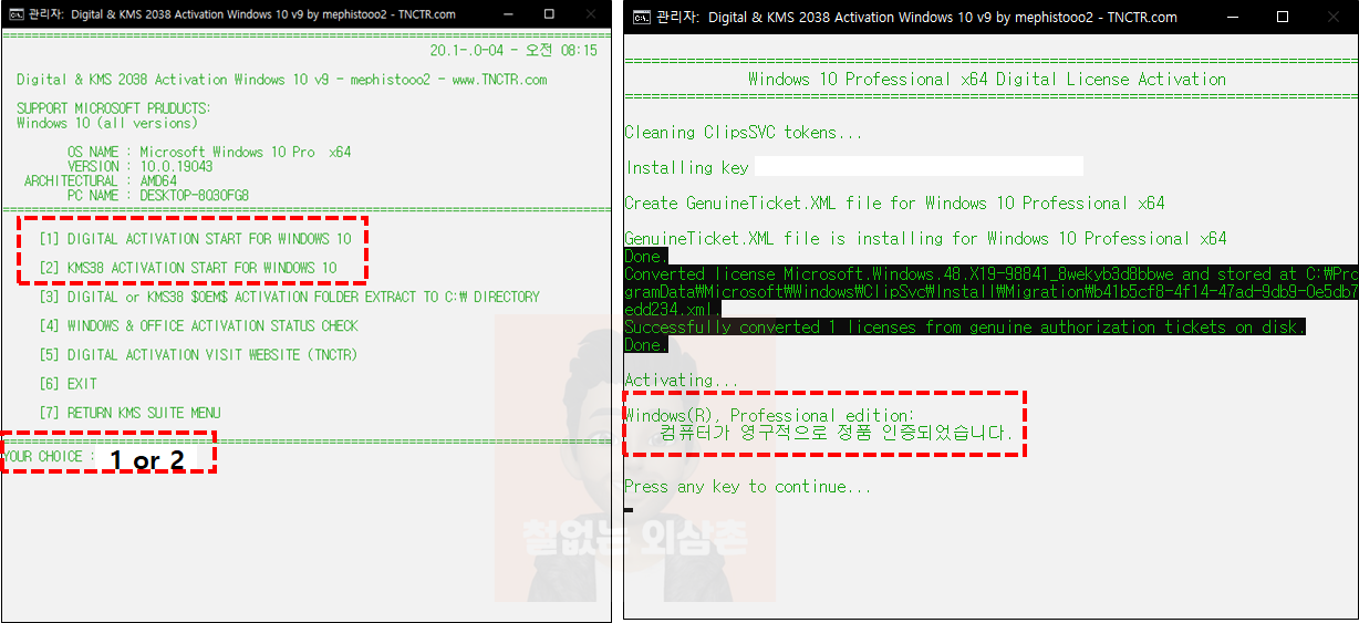 Activation start for Windows 10 ( Digital & KMS 2038 Activation Method ) 메뉴 입니다. 이 메뉴에는 Digital 라이선스와 KMS 2038을 통핸 정품인증이 진행됩니다. Digital은 영구라이선스 , KMS 2038은 2038년까지 정품인증이 유지 됩니다.