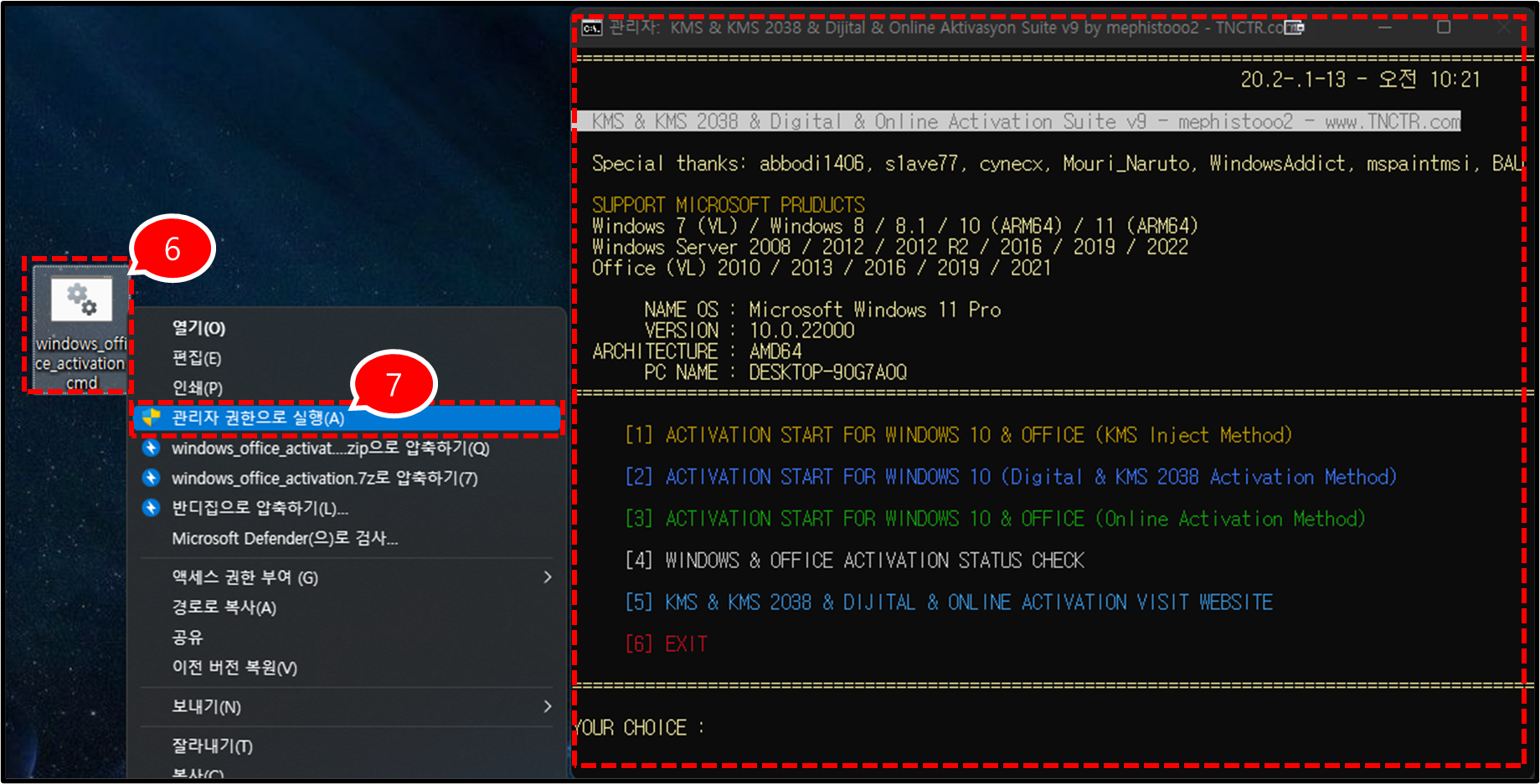 3️⃣ 방금 저장된 CMD 파일에 마우스 오른쪽 버튼을 클릭 후 "관리자 권한으로 실행"을 하면 윈도우 및 오피스를 인증 할 수 있는 화면이 실행 됩니다.
