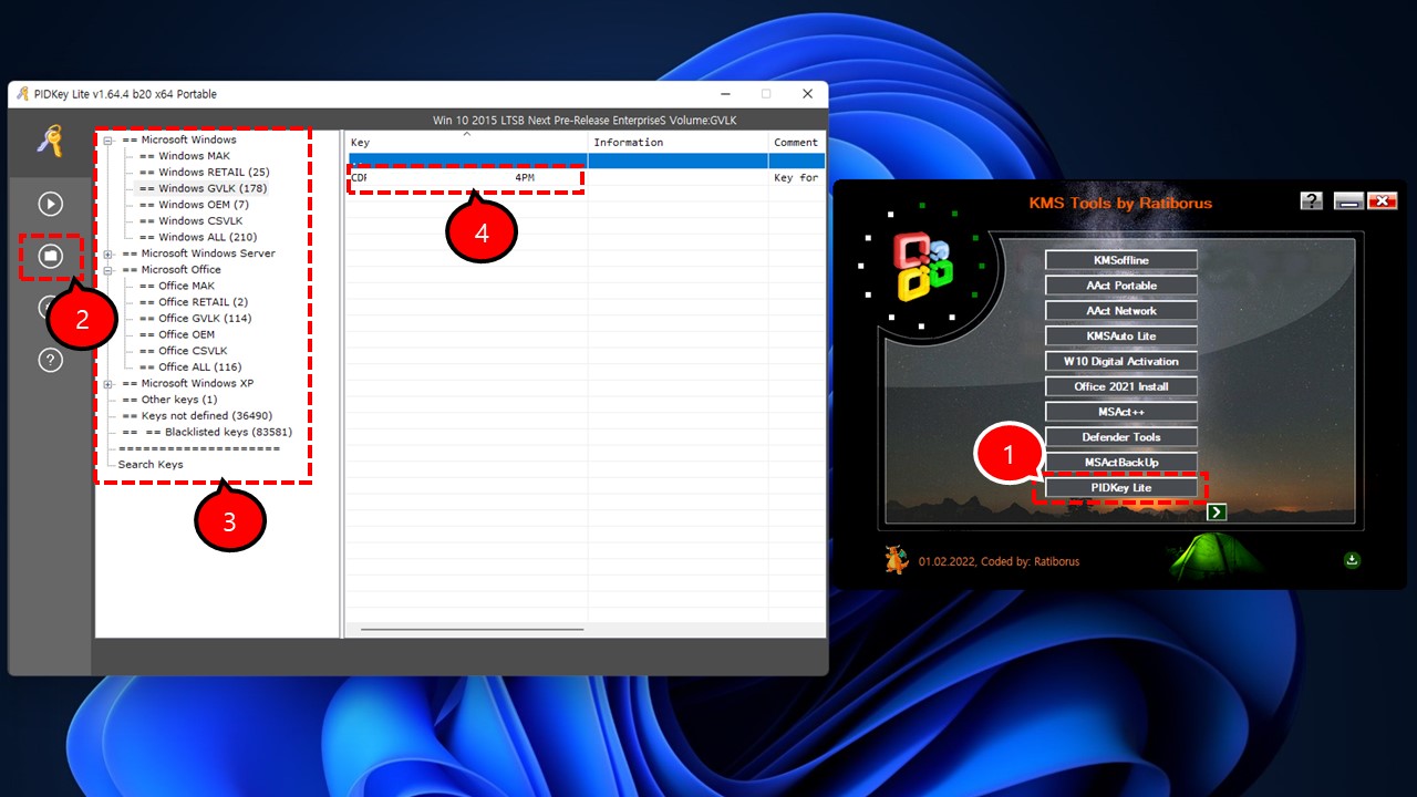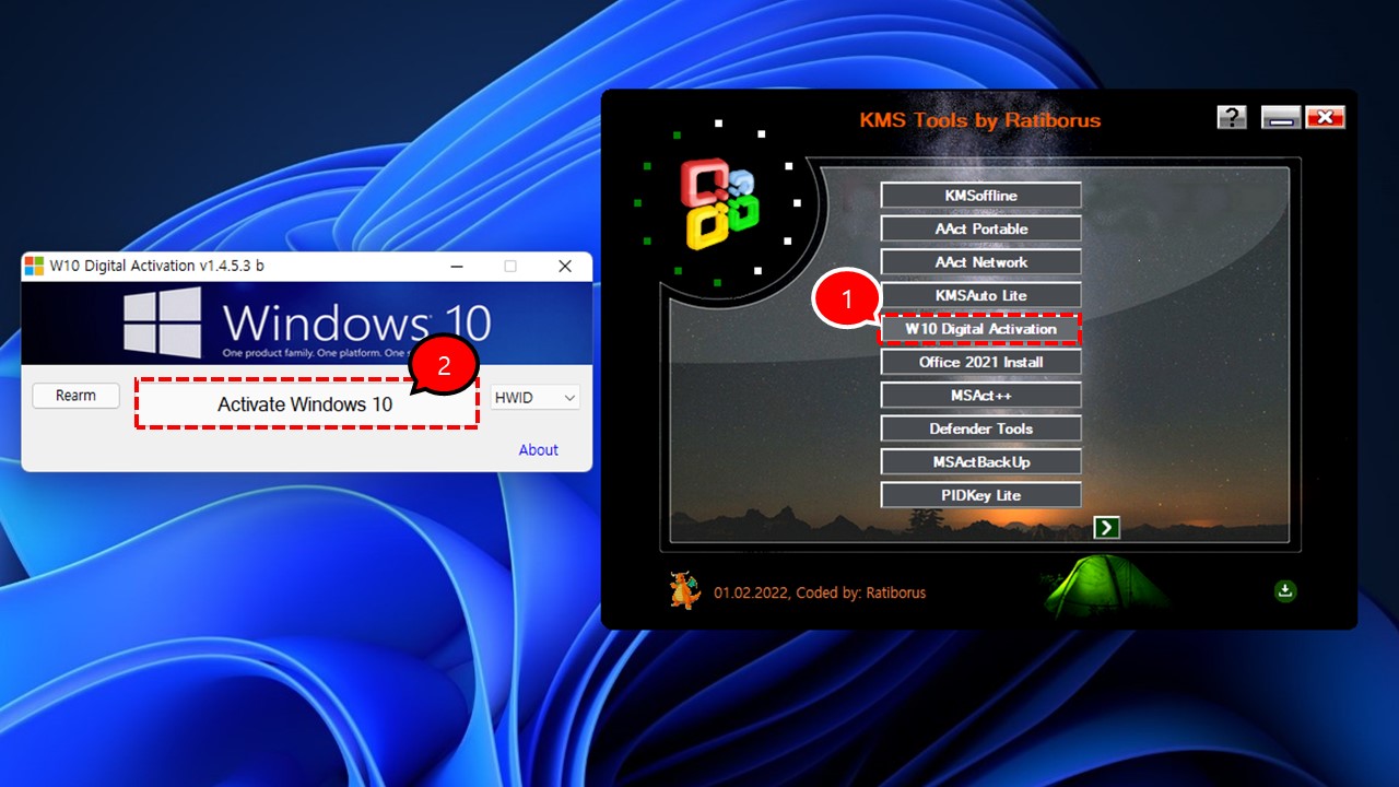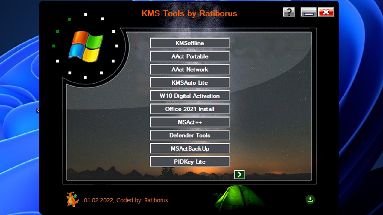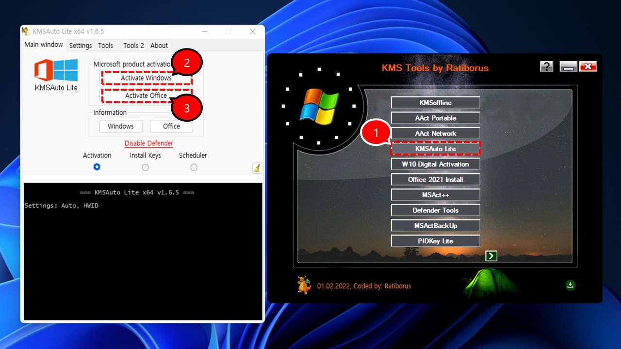 4️⃣ Ratiborus 프로그램이 실행 됩니다. ( Ratiborus 프로그램은 설치가 필요 없습니다. ) Ratiborus 프로그램에는 총 7가지 윈도우 / 오피스 인증 프로그램과 윈도우 실시간 감시 기능 끄기, MS 인증 백업, PIDKey 확인 등 인증을 도와주는 프로그램 3가지 , 이렇게 총 10가지 프로그램으로 구성되어 있습니다.
