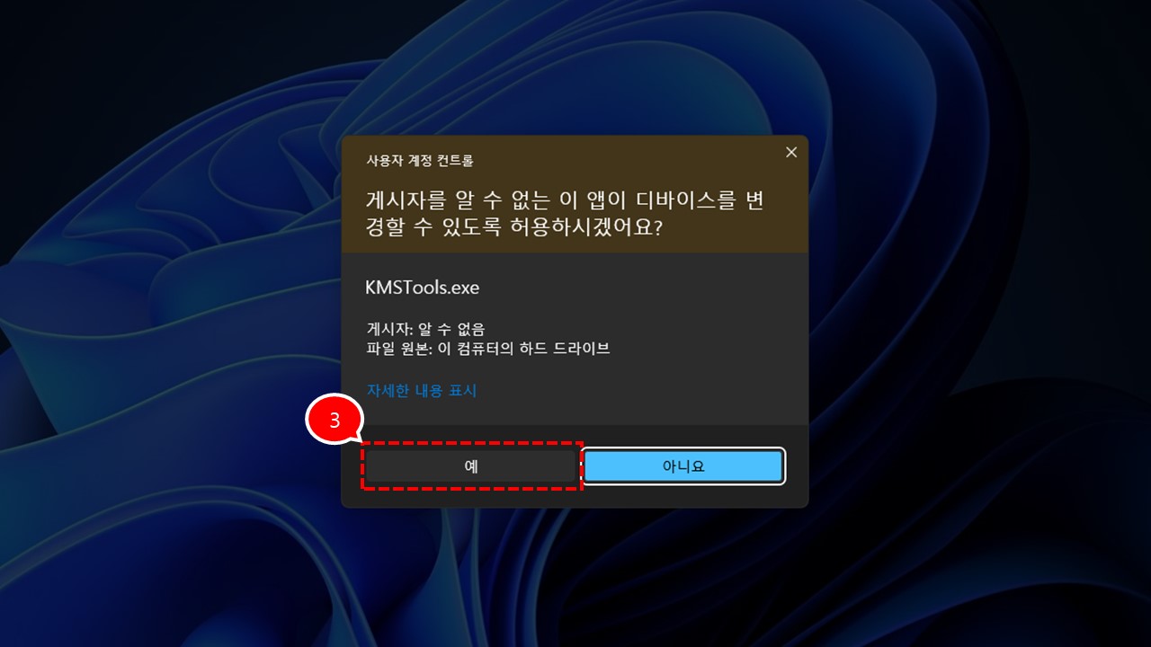 3️⃣ 사용자 계정 컨트롤 팝업창이 뜨면 "예" 버튼을 클릭 합니다.
