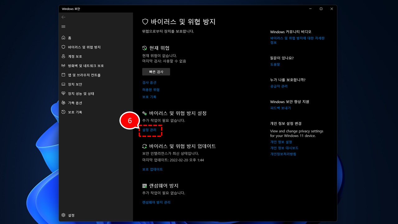 4️⃣ 바이러스 및 위협 방지 설정 항목 아래 위치한 "설정 관리" 버튼을 클릭 합니다.