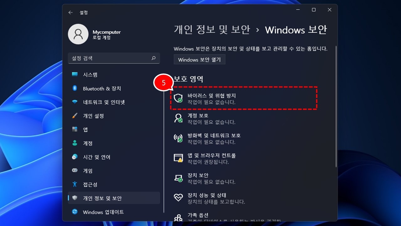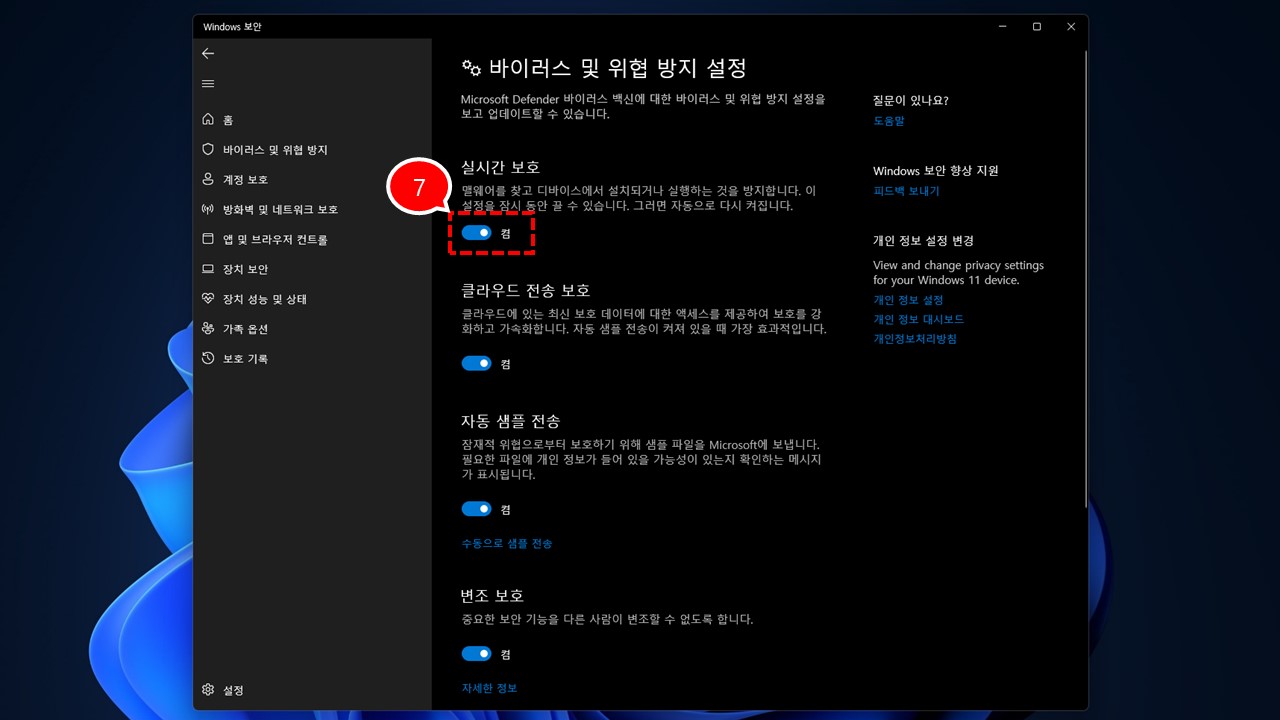 7️⃣ 실시간 보호가 "끔" 상태로 변경이 됩니다. 윈도우 11 제품인증 작업이 완료되면 다시 켜겨나, 재부팅을 하시면 실시간 보호 기능이 자동으로 실행 됩니다.