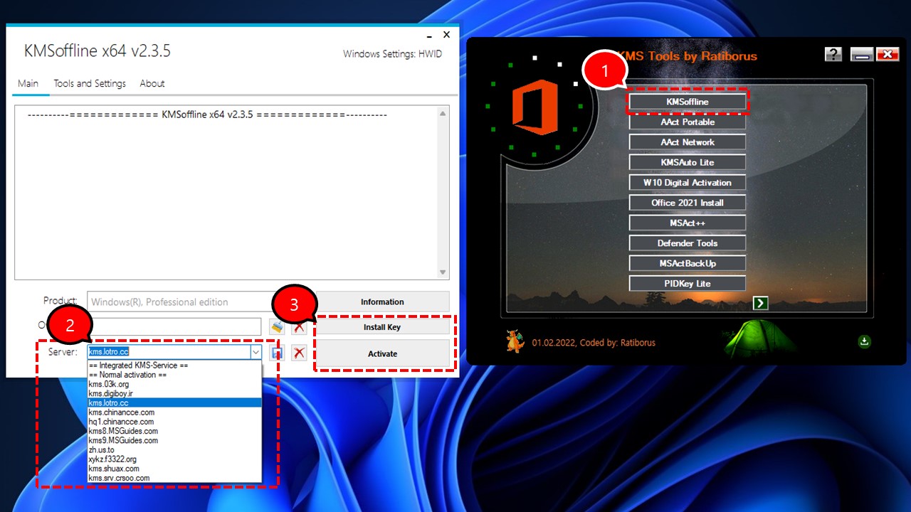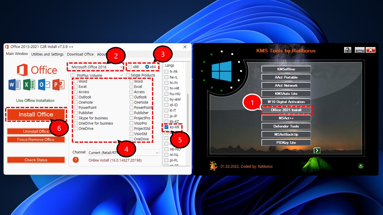 Office 2021 Intall 은 MS 오피스 모든 버전을 설치해주는 기능입니다. MS 오피스 버전을 선택 → 64x / x86 시스템 종류를 선택 → 설치 할 오피스 프로그램 선택 ( Word, Excel, PPT 등등 ) → 한글판 오피스를 설치하기 위해서 ko-KR 를 체크 후 Install Office 버튼을 눌러주시면 여러분들이 선택한 MS 오피스가 설치 됩니다. 인증은 Ratiborus의 여러 인증 프로그램 중에 하나를 선택하여 인증 하시면 됩니다.
