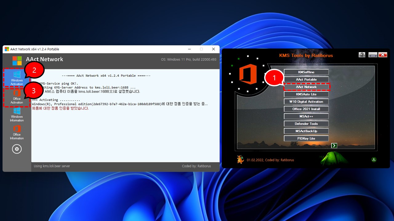AAct Portable 기능은 윈도우와 오피스 모든 버전을 인증 할 수 있는 기능입니다. AAct Portable 화면이 뜨면 왼쪽에 Windows Activation , Office Activation 버튼을 클릭하면 각각 프로그램 인증이 진행 됩니다.
