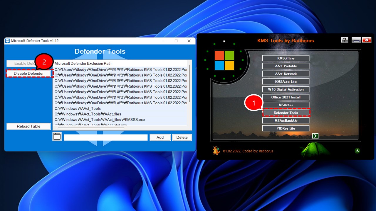 Defender Tools는 윈도우 실시간 감시 기능을 꺼주는 기능 입니다. 사실 실행전에 이미 윈도우 실시간 감시 기능을 꺼놓기 때문에 필요 없는 기능이라고 생각하시면 되겠습니다.