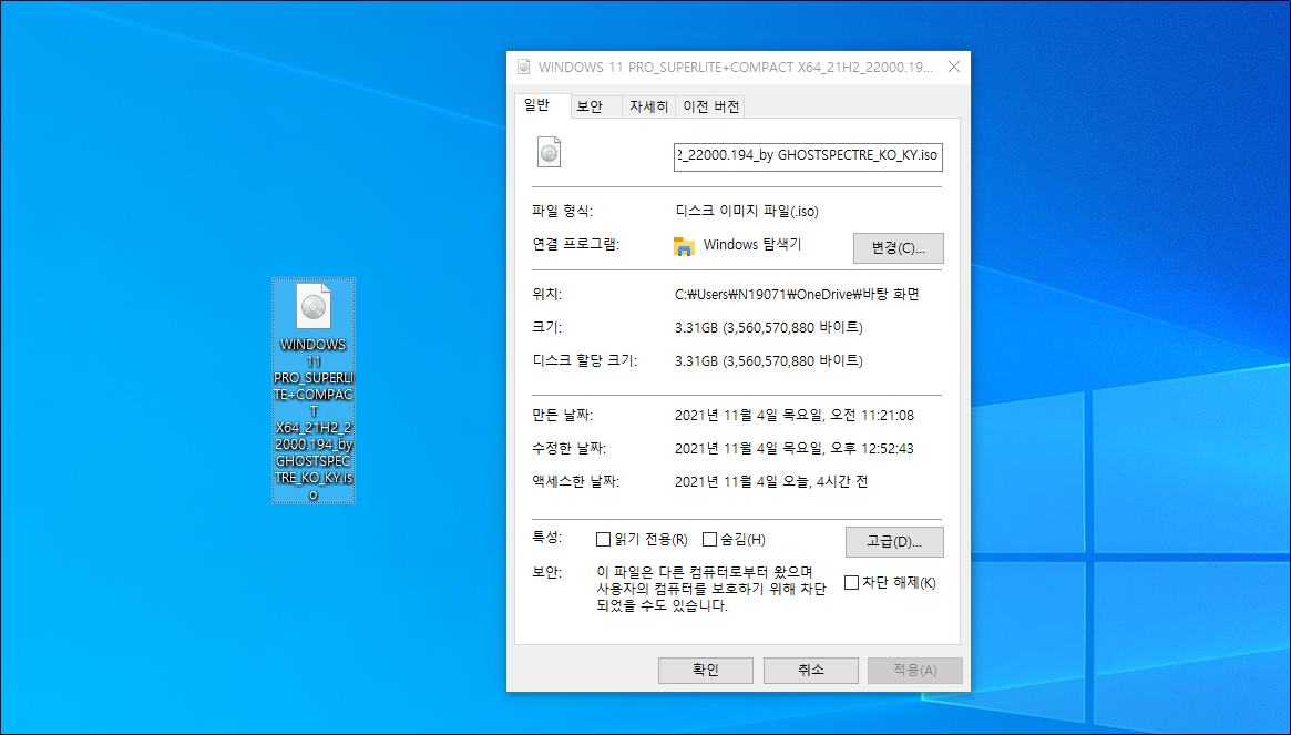 2️⃣ 다운로드 받은 ISO 이미지 파일은 약 3.31GB 정도 되며, 설치를 위해서는 반드시 4GB 이상의 USB가 필요합니다.