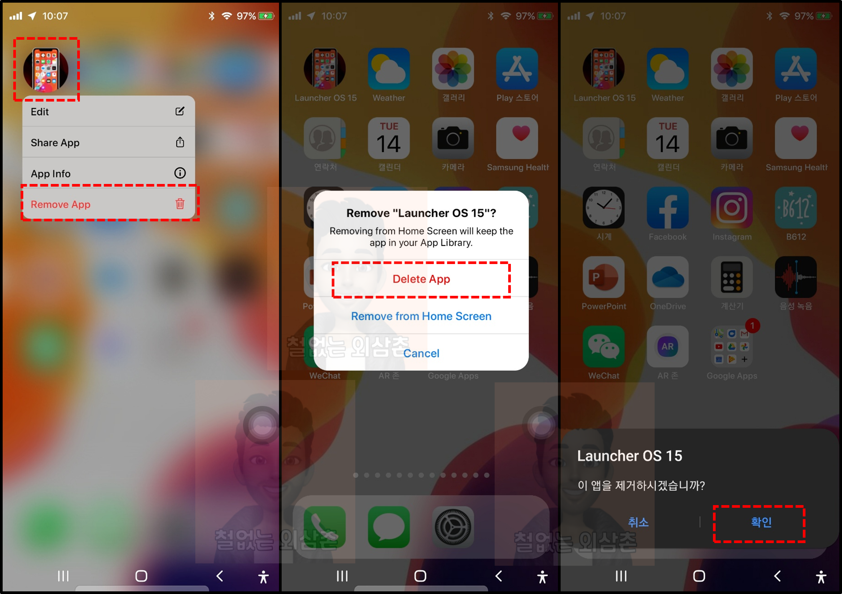 홈화면에 있는 Launcher OS 15 아이콘을 꾹~ 누르면 컨텍스트 메뉴가 뜨는데 Remove App 항목을 눌러서 삭제를 하시면 원래 여러분들이 사용하던 안드로이드 스마트폰 테마로 복구 됩니다.!!!
