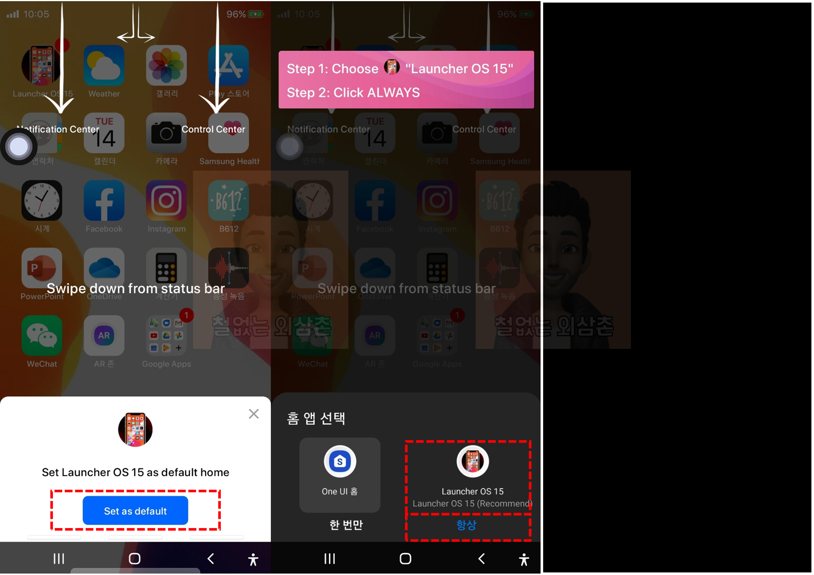 7️⃣ 런쳐 실행 후 팝업창이 뜨면 "Set as default" 버튼을 눌러주시고 홈 앱 선택 팝업창이 뜨면 "Launcher OS 15" 항목을 선택 후 "항상" 버튼을 눌러줍니다.