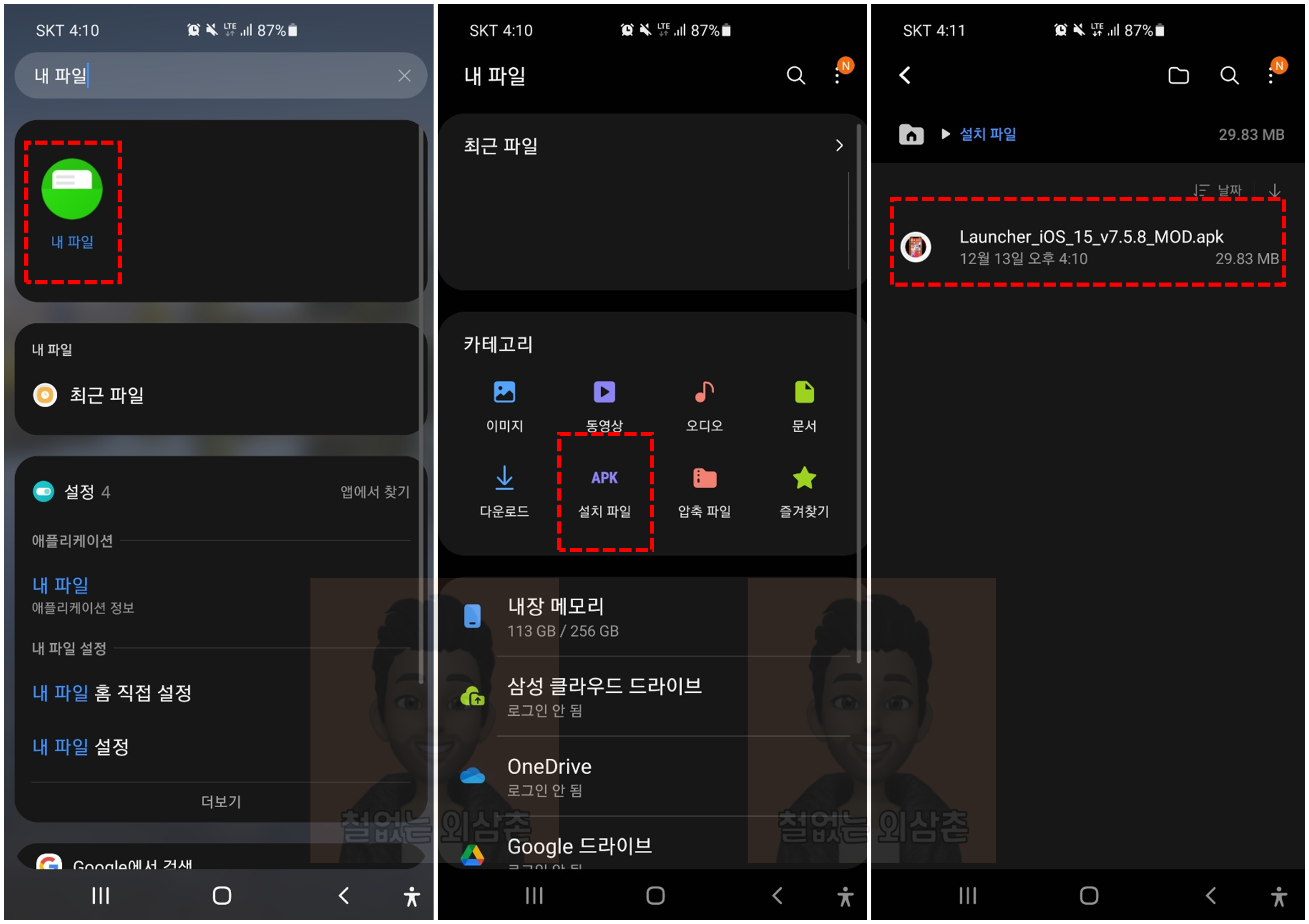 2️⃣ 안드로이드 스마트폰에 기본적으로 설치되어 있는 "내 파일" 어플을 실행 후 카테고리목록에 APK 설치파일을 선택하여 Launcher iOS apk 파일을 실행합니다.