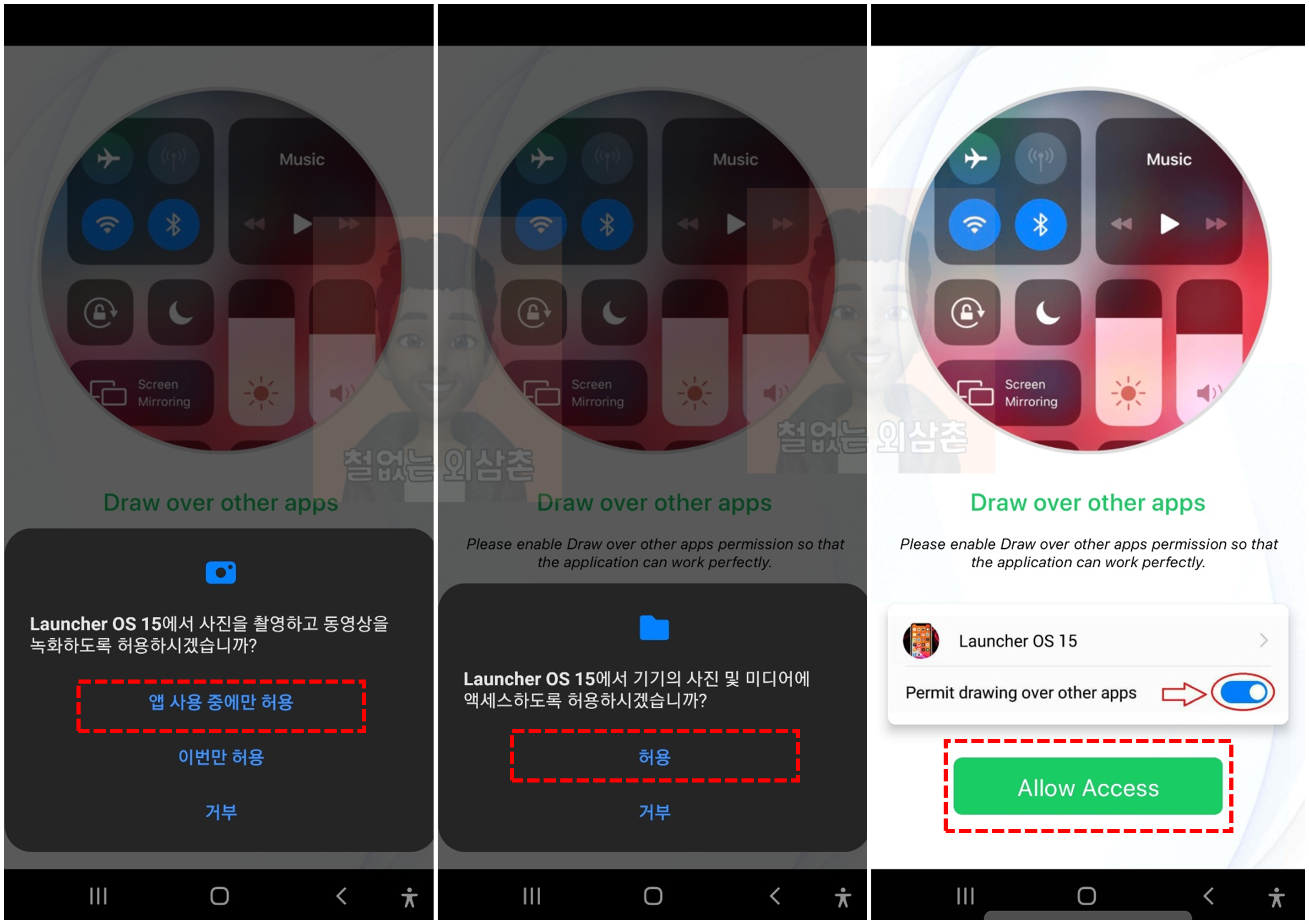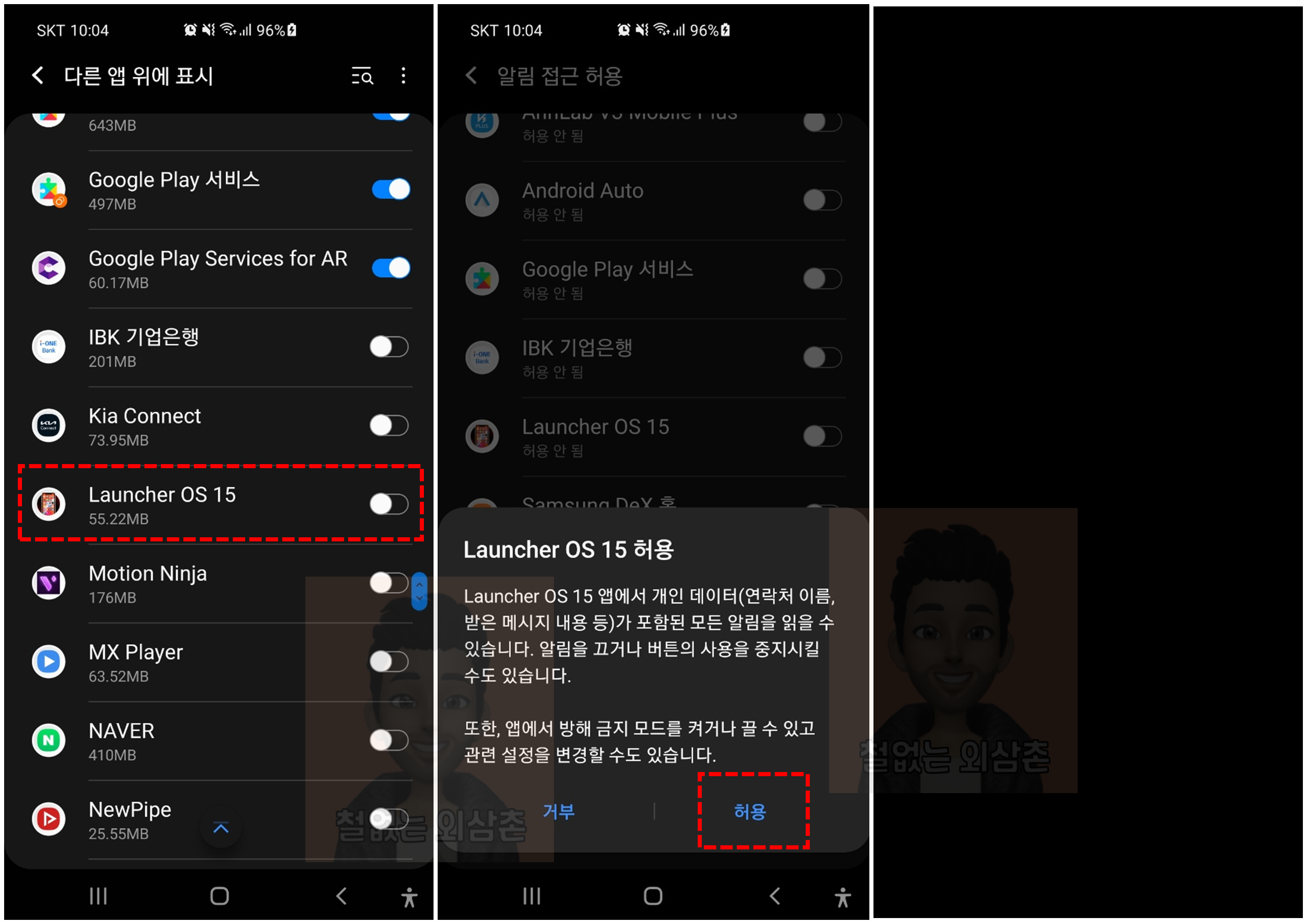 5️⃣ 다른 앱 위에 표시 설정 화면이 뜨면 "Launcher OS 15" 항목을 찾아서 오른쪽에 위치한 활성화 단추를 누르면 팝업창이 뜨는데 허용 버튼을 눌러줍니다.