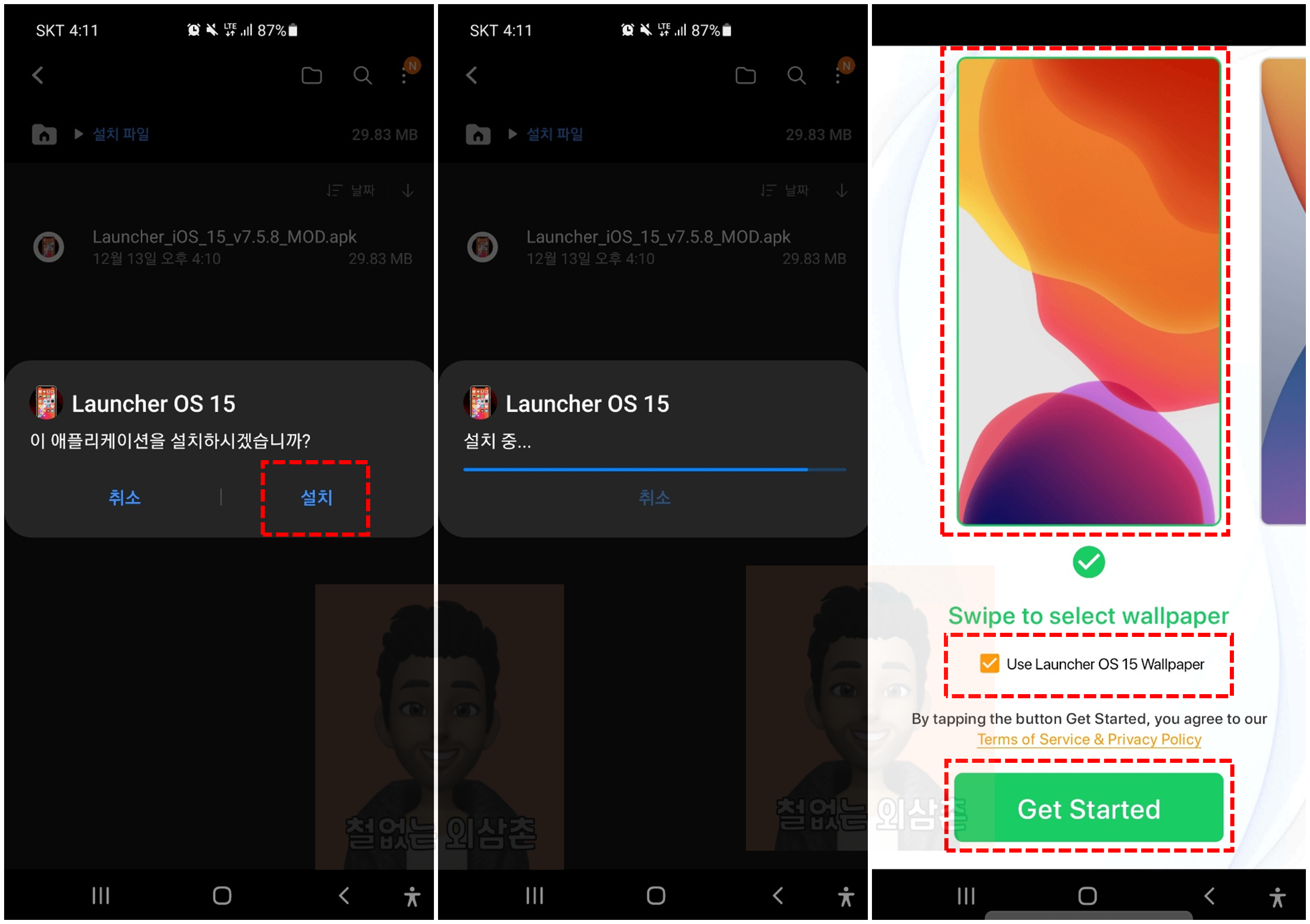 3️⃣ 설치 팝업창이 뜨면 설치 버튼을 누르고, 설치가 완료되면 아이폰 테마 설정이 진행됩니다. 모두 영어로 되어 있으나 전혀 어렵지 않습니다. 먼저 아이폰테마에 사용할 배경화면을 선택 후 중간에 " Use Launcher OS 15 Walllpaper " 옵션에 체크 후 Get Started 버튼을 누릅니다.