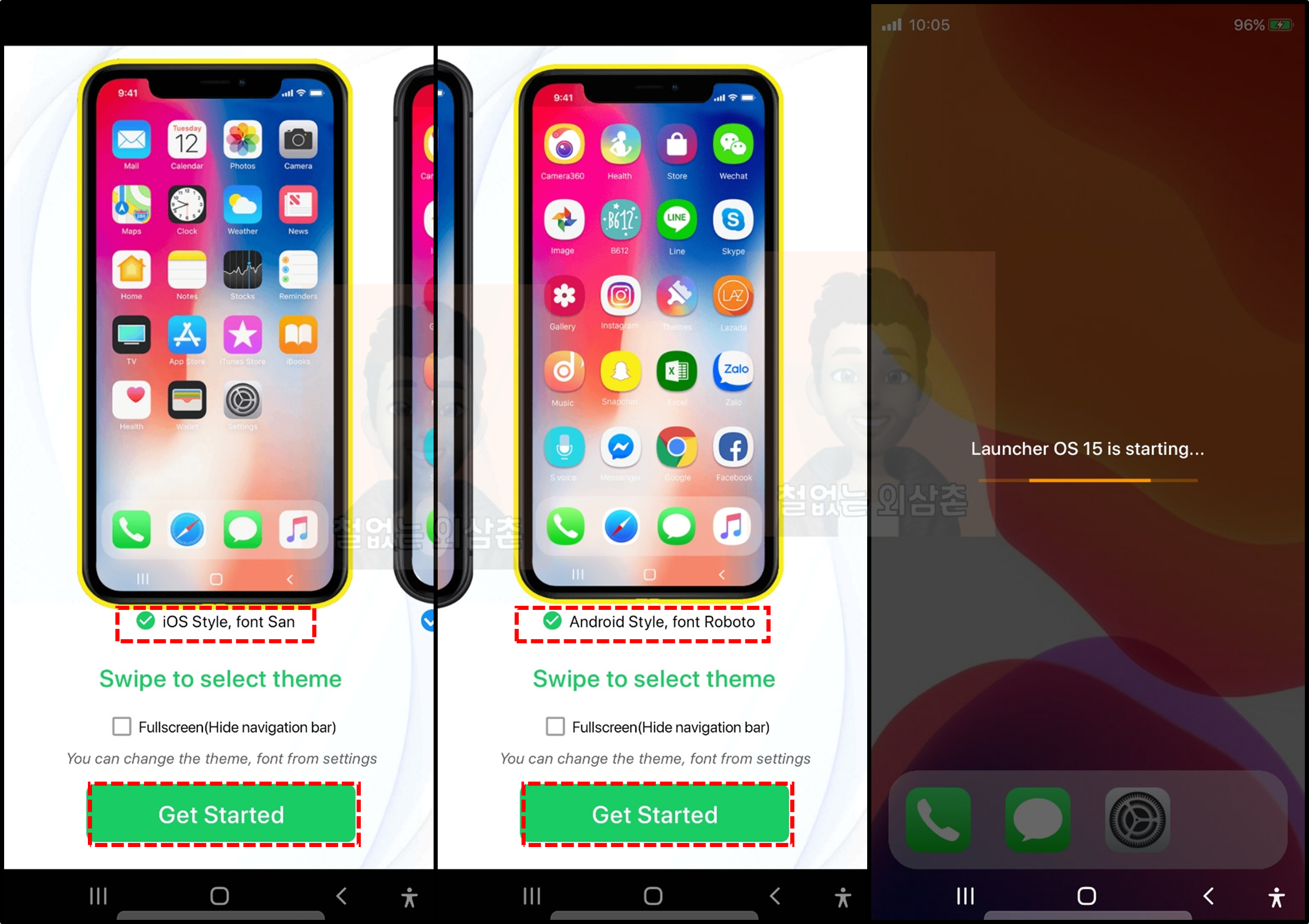 6️⃣ iOS 폰트 또는 안드로이드 폰트를 사용 할 것인지 설정 할 수 있는데 여러분들의 취향에 맞게 폰트를 선택 후 Get Started 버튼을 누르면 iOS 런처가 실행됩니다.