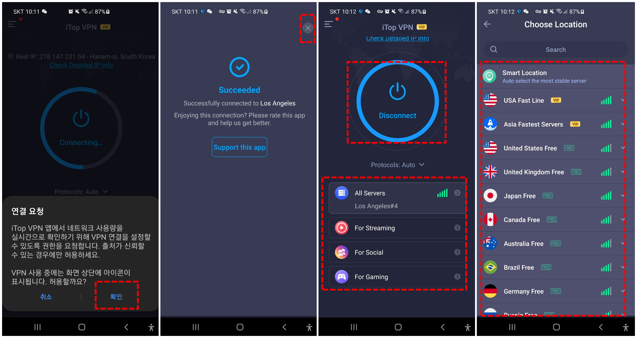 5️⃣ VPN 연결 진행 중 연결 요청 팝업창이 뜨면 확인 버튼을 누르고 성공되었다는 화면으로 이동 되는데 우측 상단에 X 아이콘을 누르면 연결이 완료되어 있는 화면으로 이동 됩니다. 연결을 끊고 싶으면 다시한번 중앙에 위치한 Disconnect 버튼을 눌러주면 되고, 연결 버튼 아래에 위치한 버튼들은 스트리밍, SNS, 게임 용 VPN 서버로 나뉠수 있고 각 버튼을 눌러보면 20개 이상의 국가의 VPN 서버를 선택 할 수 있습니다. 여러분들이 원하는 국가의 VPN 서버를 선택하여 사용하시면 되겠습니다.