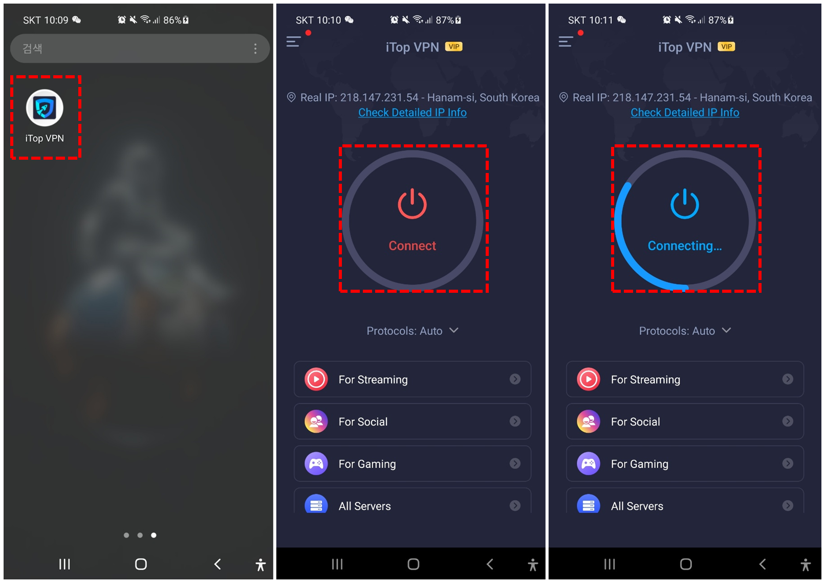 4️⃣ 설치가 완료되면 스마트폰 바탕화면에 생성된 iTOP VPN 아이콘을 눌러서 어플을 실행 해줍니다. 어플 실행 후 중앙에 위치한 Connect 버튼을 눌러주시면 VPN 연결이 진행됩니다.