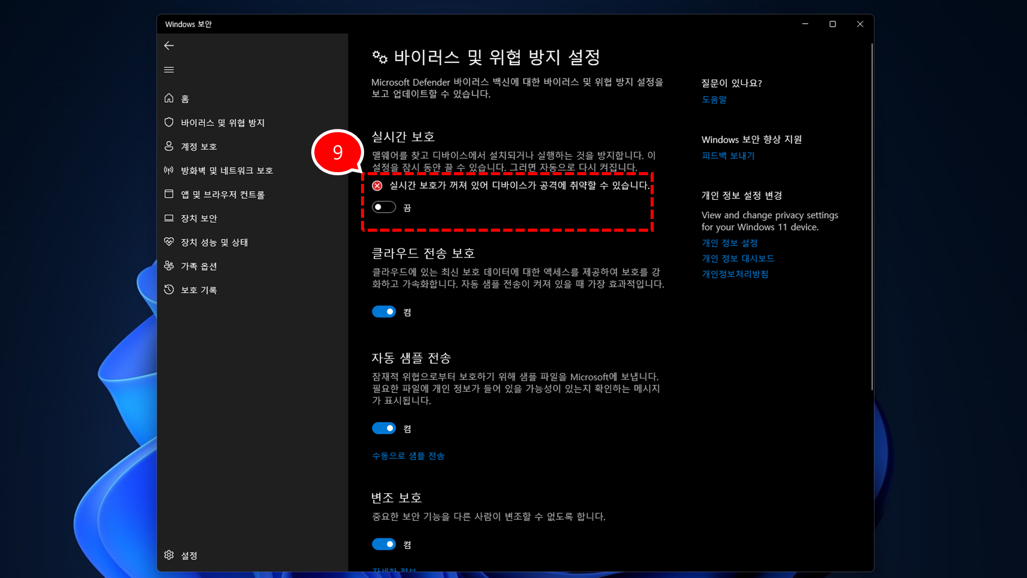5️⃣ 실시간 보호 항목이 "켬" 상태로 되어 있는데 , 단추를 클릭 합니다.