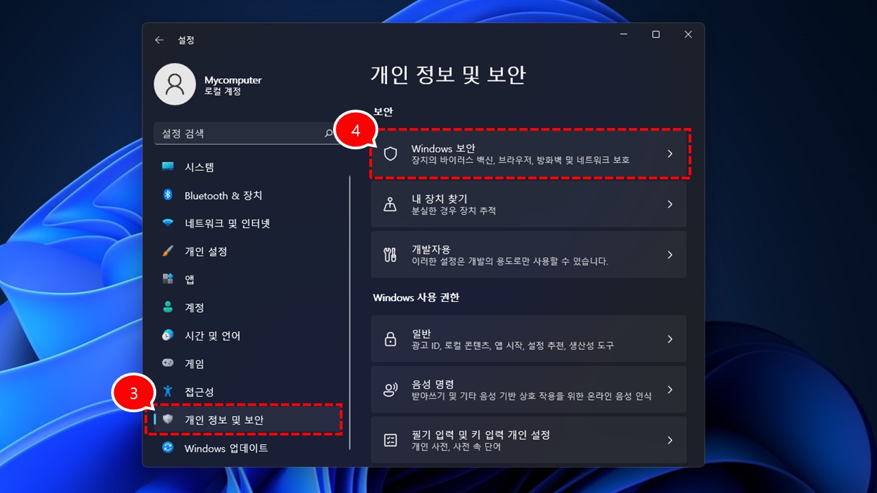 2️⃣ 설정 팝업창이 뜨면 왼쪽에 "개인 정보 및 보안" - "Windows 보안" 메뉴로 이동 합니다.