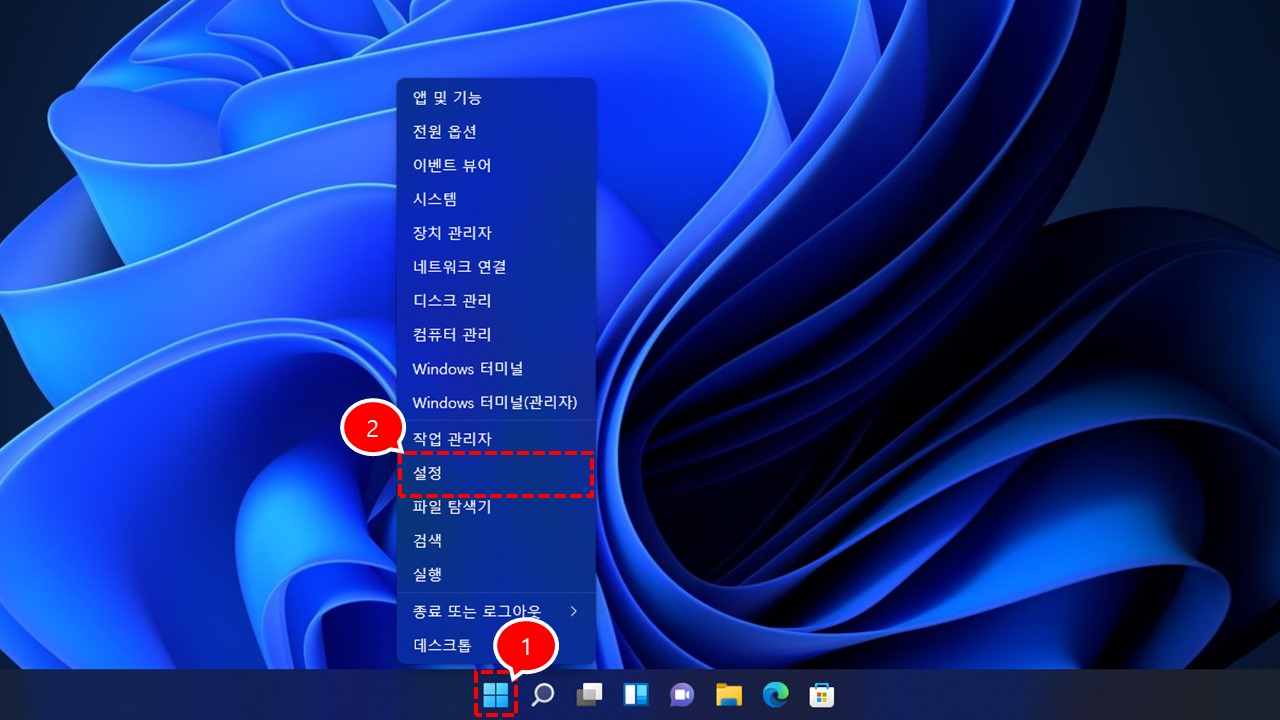 1️⃣윈도우11 시작 메뉴 마우스 오른쪽 버튼을 클릭 후 "설정" 메뉴를 클릭 합니다.