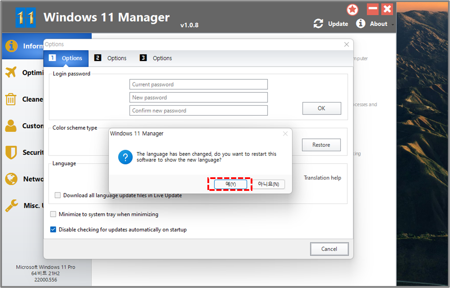 3️⃣ 언어를 변경하려면 프로그램을 재시작해야 한다는 팝업창이 뜨는데 예 버튼을 눌러줍니다.