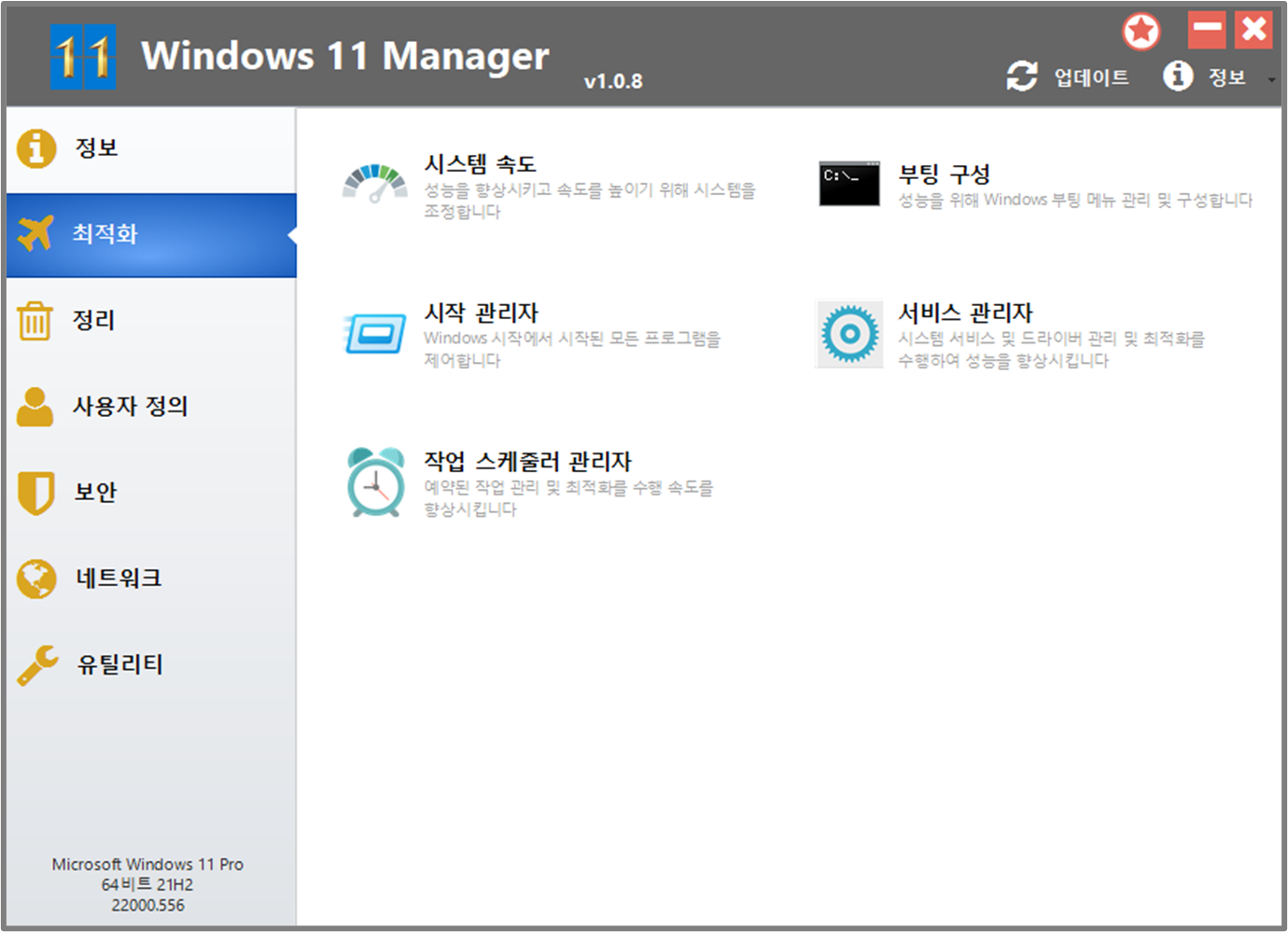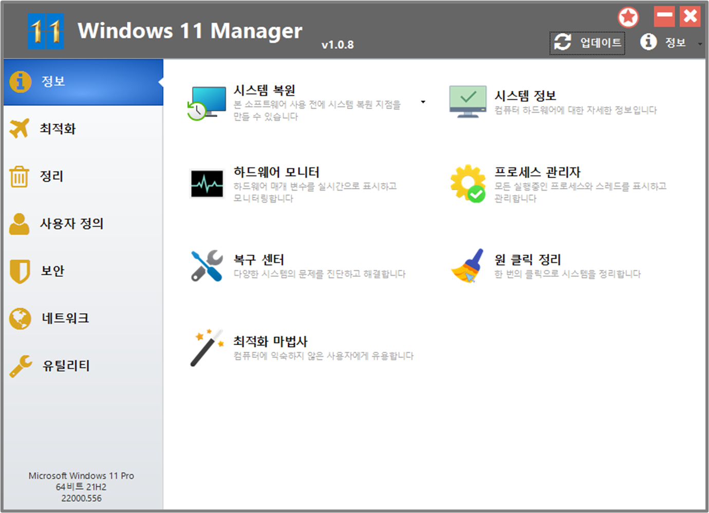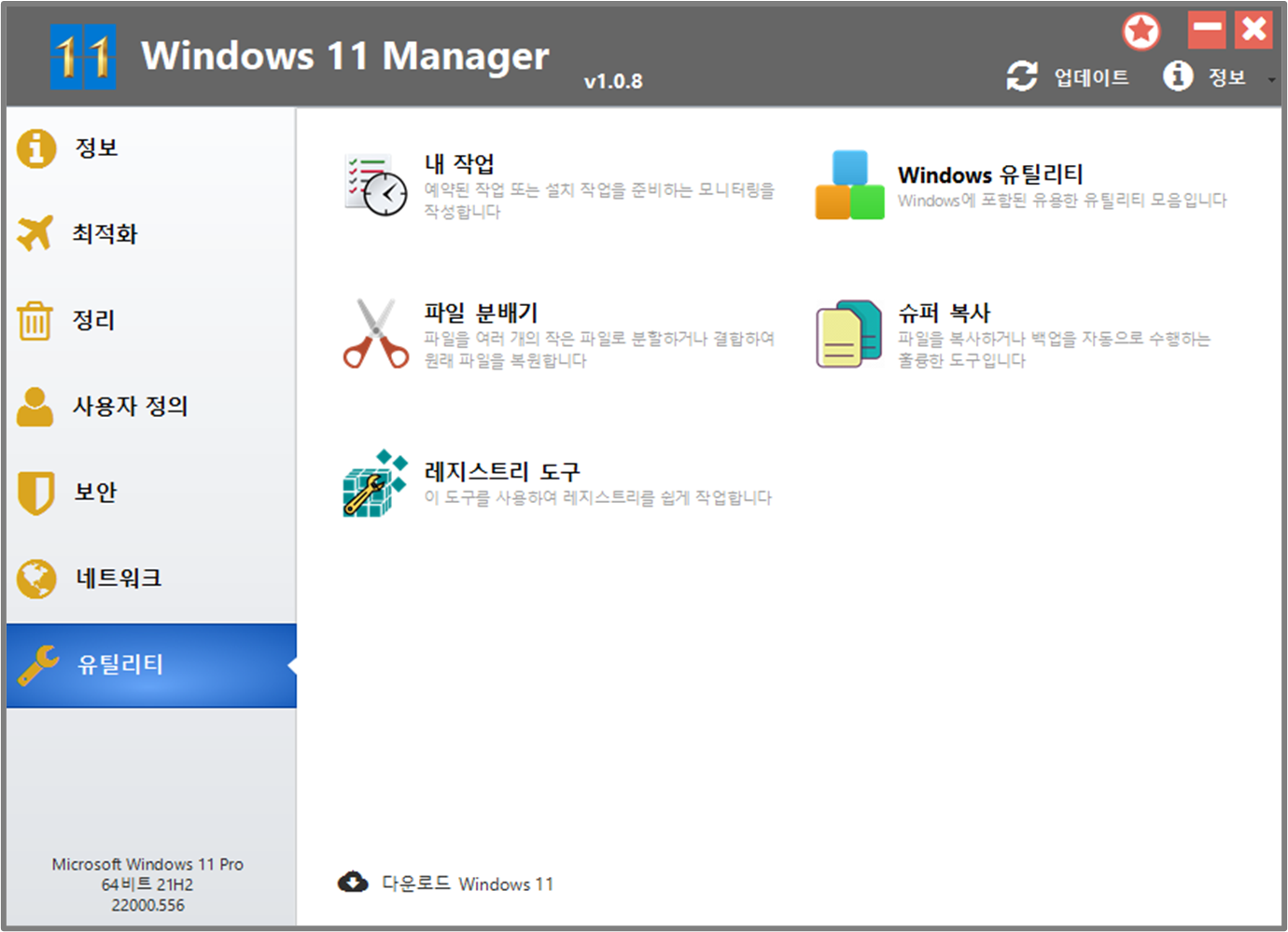 Windows 11 MAnager에는 정보, 최적화, 정리, 사용자정의, 보안, 네트워크, 유틸리티 등 총 6가지 메뉴가 존재 하며 이 기능들은 윈도우11 운영체제 전체를 아우르는 강력한 관리 기능을 포함하고 있습니다. 각 기능들에 대해 간략하게 알아보겠습니다.