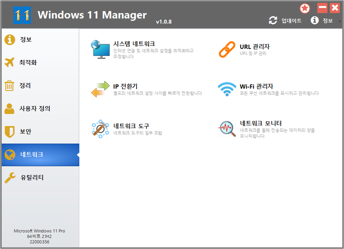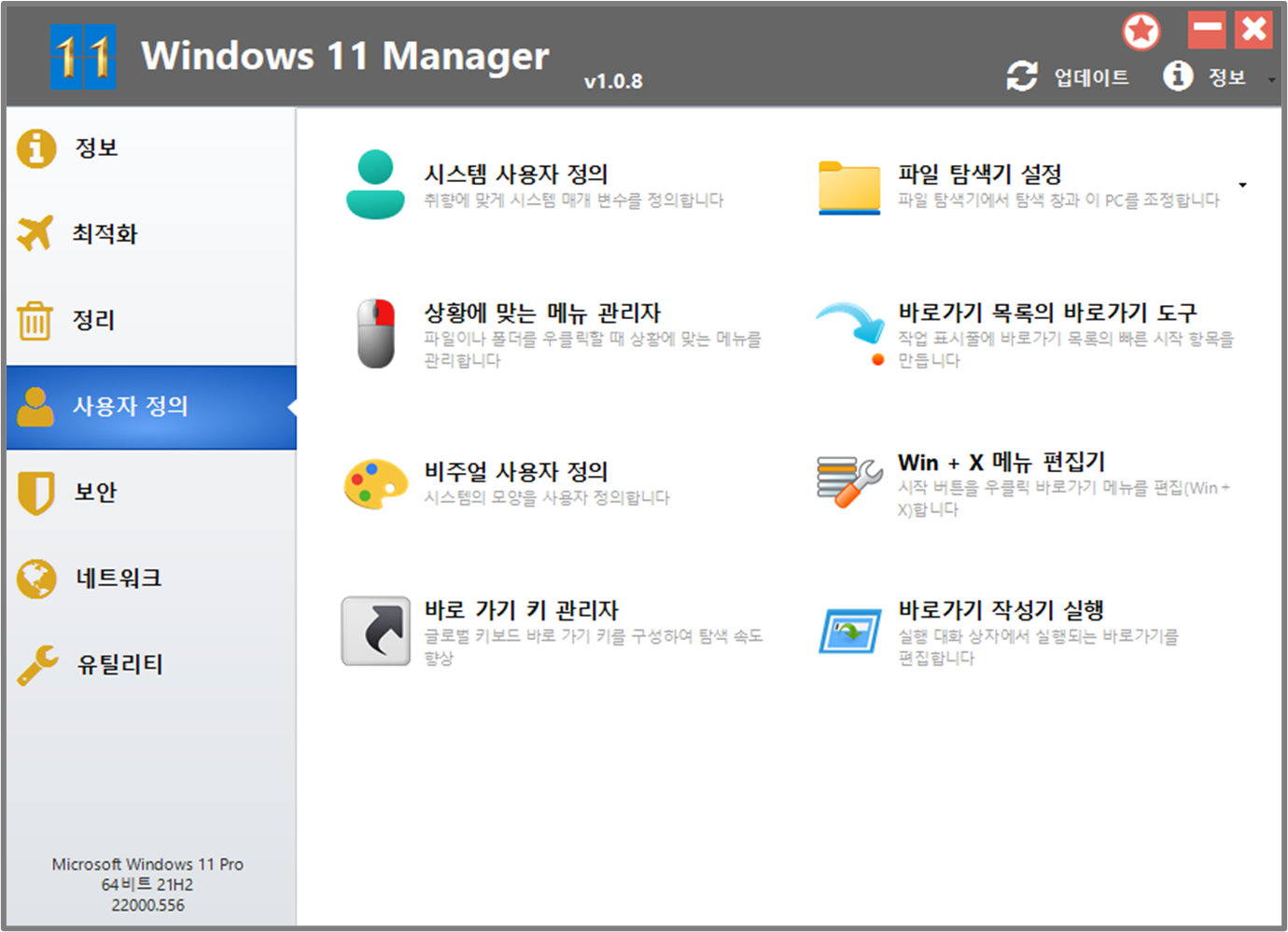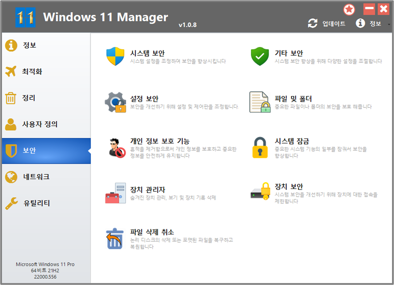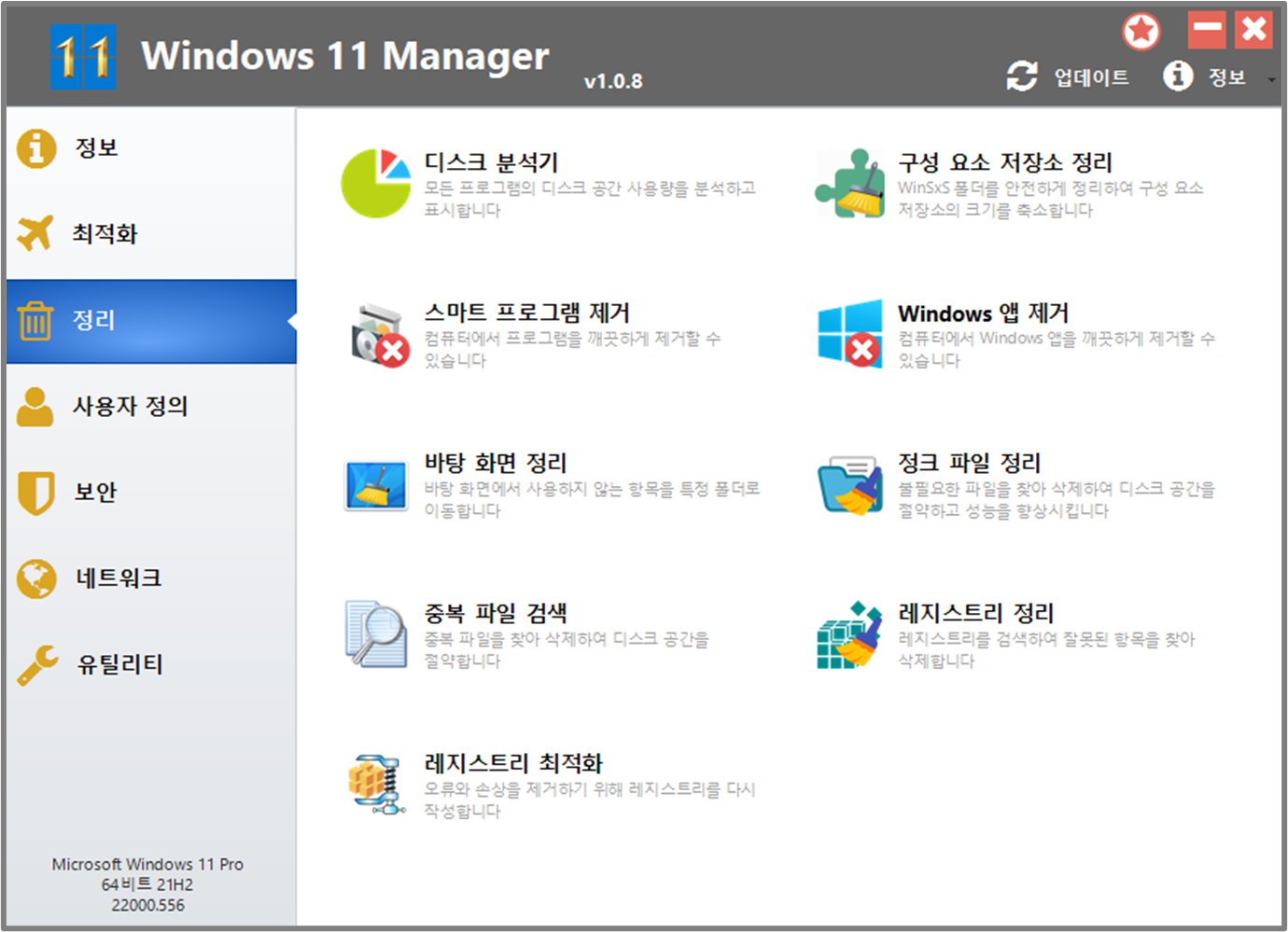 Windows 11 MAnager에는 정보, 최적화, 정리, 사용자정의, 보안, 네트워크, 유틸리티 등 총 6가지 메뉴가 존재 하며 이 기능들은 윈도우11 운영체제 전체를 아우르는 강력한 관리 기능을 포함하고 있습니다. 각 기능들에 대해 간략하게 알아보겠습니다.