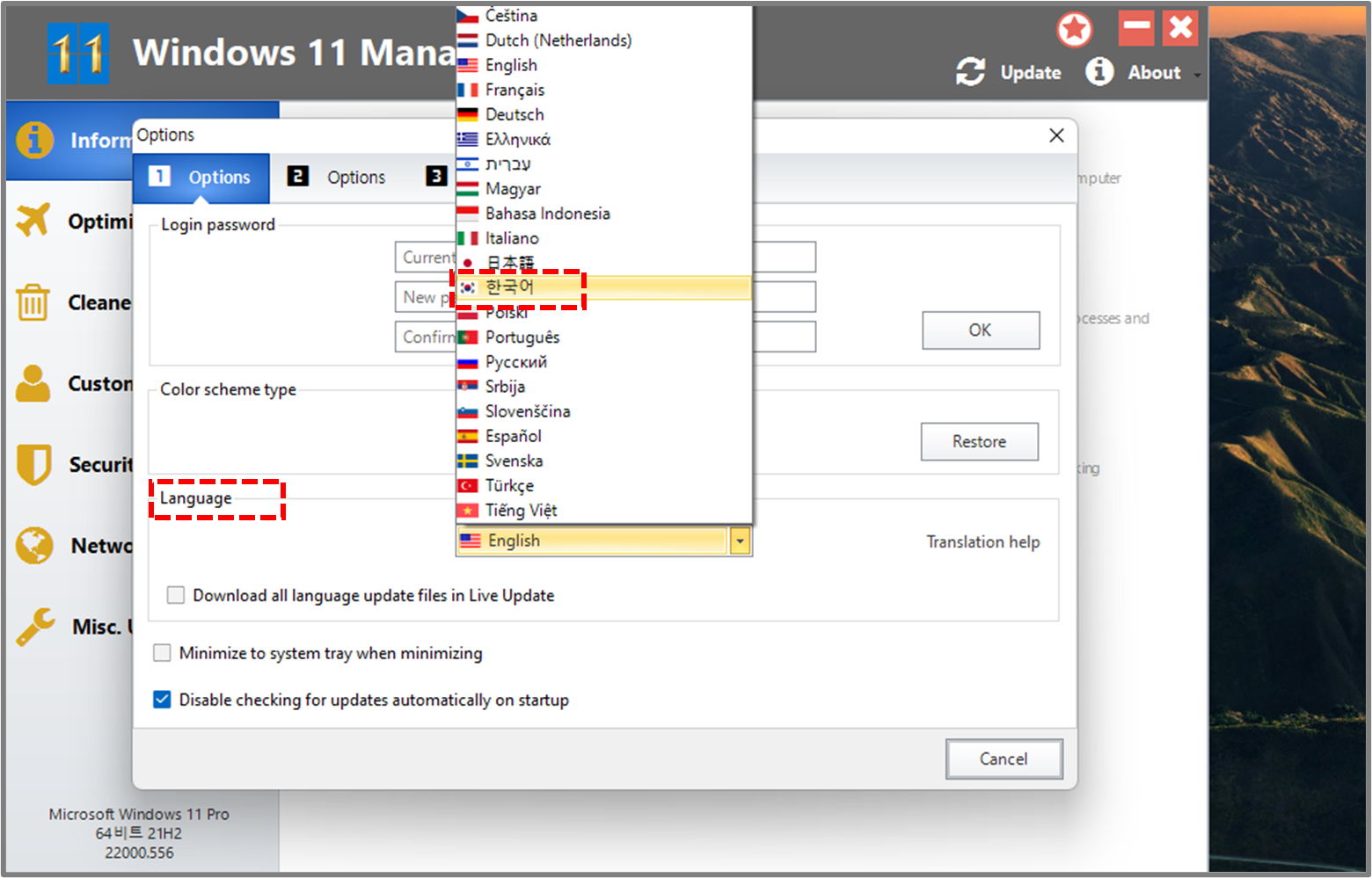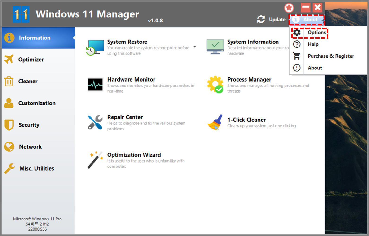 1️⃣ Windows11 Manager 프로그램을 실행하면 처음에는 언어가 영어로 되어 있는데, 한글로 변경하는 방법을 알아보겠습니다. 오른쪽 상단에 About 버튼을 클릭 후 Options 메뉴를 클릭 합니다.