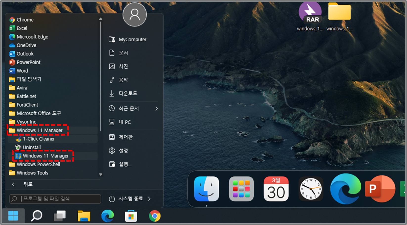 4️⃣ Windows11 Manager 최적화 프로그램을 설치가 완료되도 바탕화면에 아이콘이 생성이 안되기 때문에 시작 버튼을 눌러서 Windows11 Manager 프로그램을 찾아서 실행을 해줍니다.