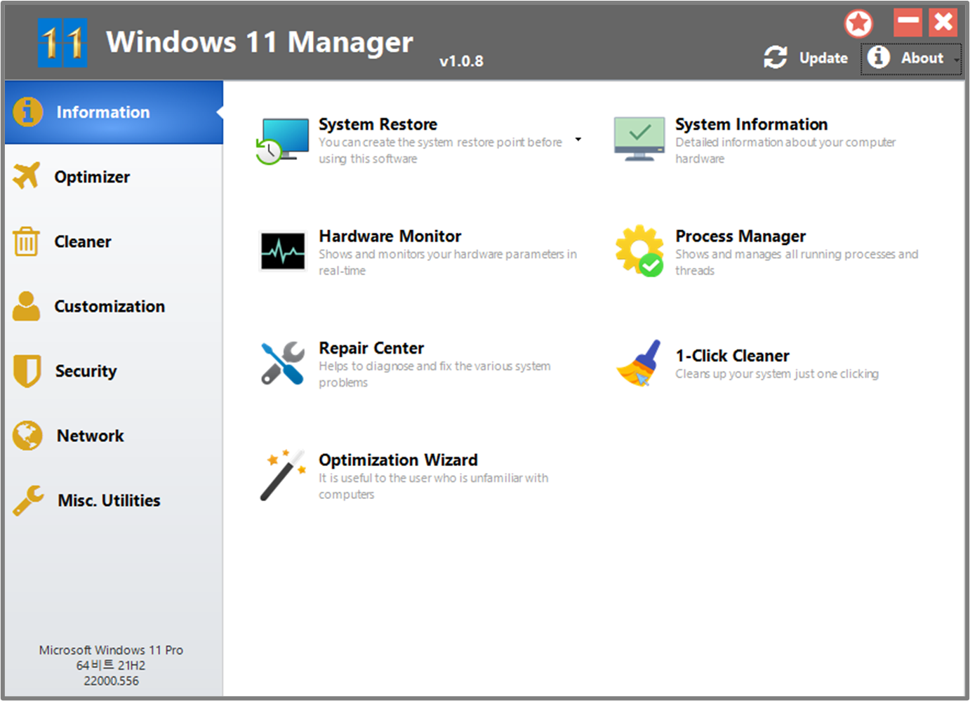 5️⃣ 굉장히 심플한 디자인의 Windows 11 Manager 최적화 프로그램이 실행 됩니다.