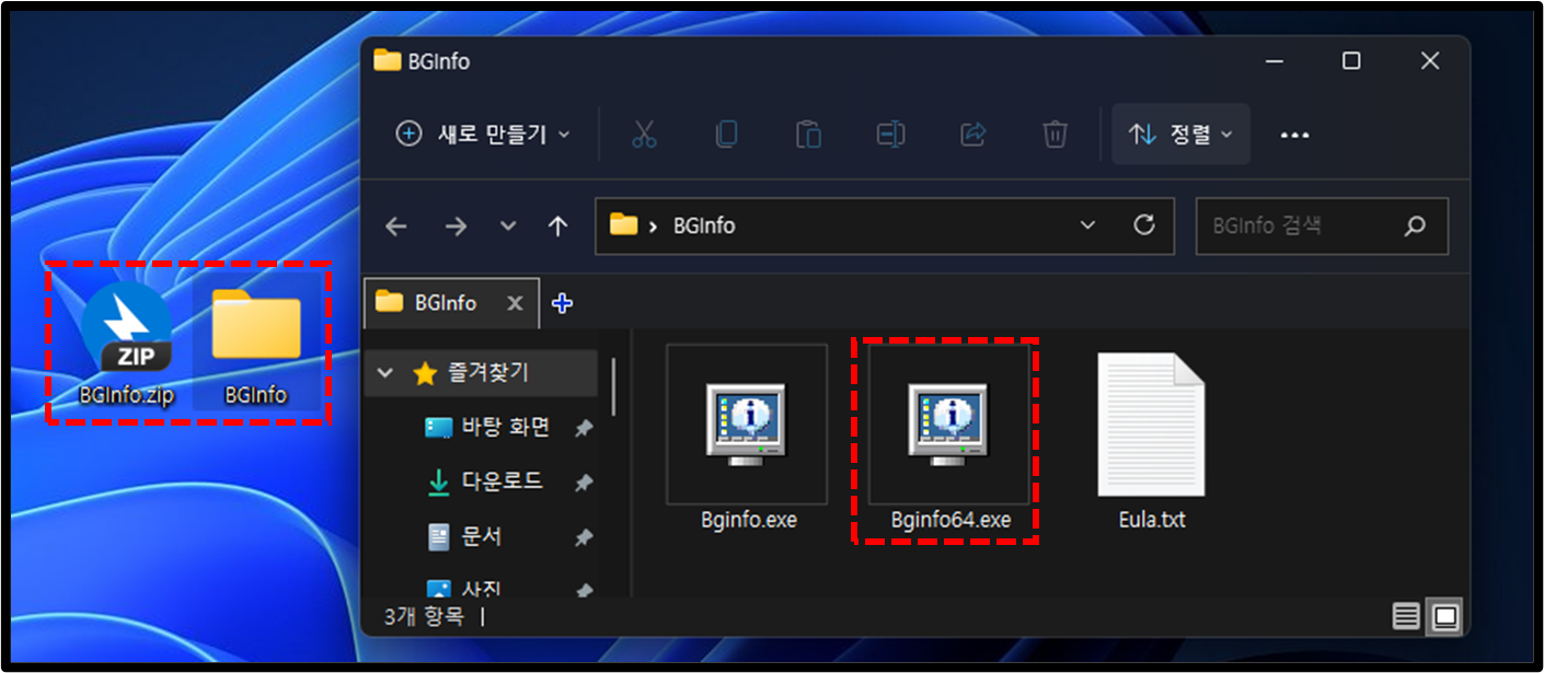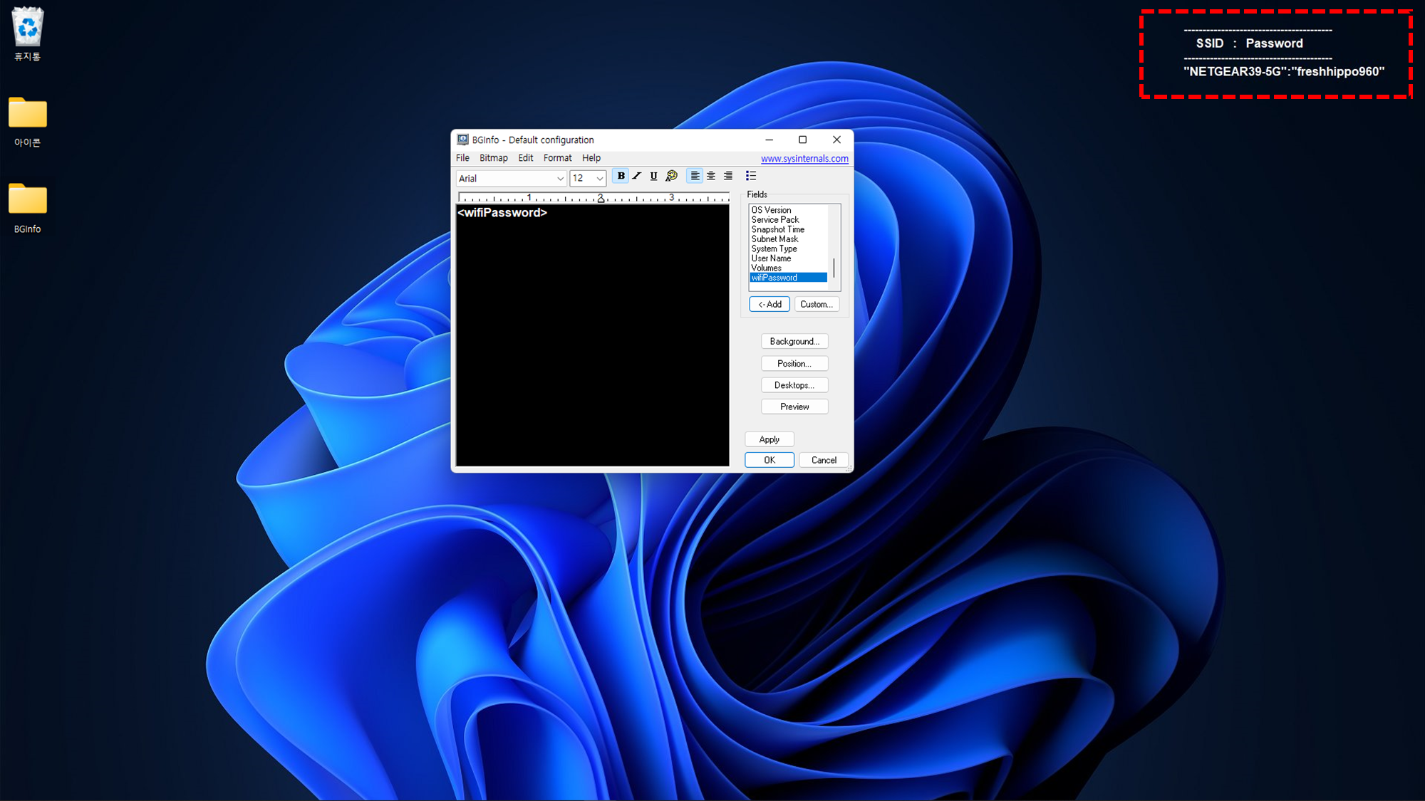 이런 방식으로 바탕화면에 계속 표시하고 싶은 정보가 있다면 정보를 TEXT로 저장하고 BgInfo 프로그램을 통해 바탕화면에 정보를 표시하시면 되겠습니다.
