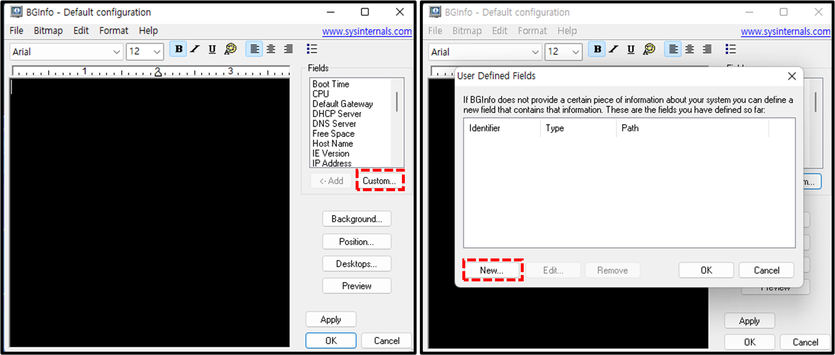 4️⃣ 이제 bgInfo 프로그램을 통해서 바탕화면에 WifiPassword 정보를 표시해보겠습니다. 먼저 필드 목록 아래에 Custom 버튼을 클릭 후 New 버튼을 클릭 합니다.