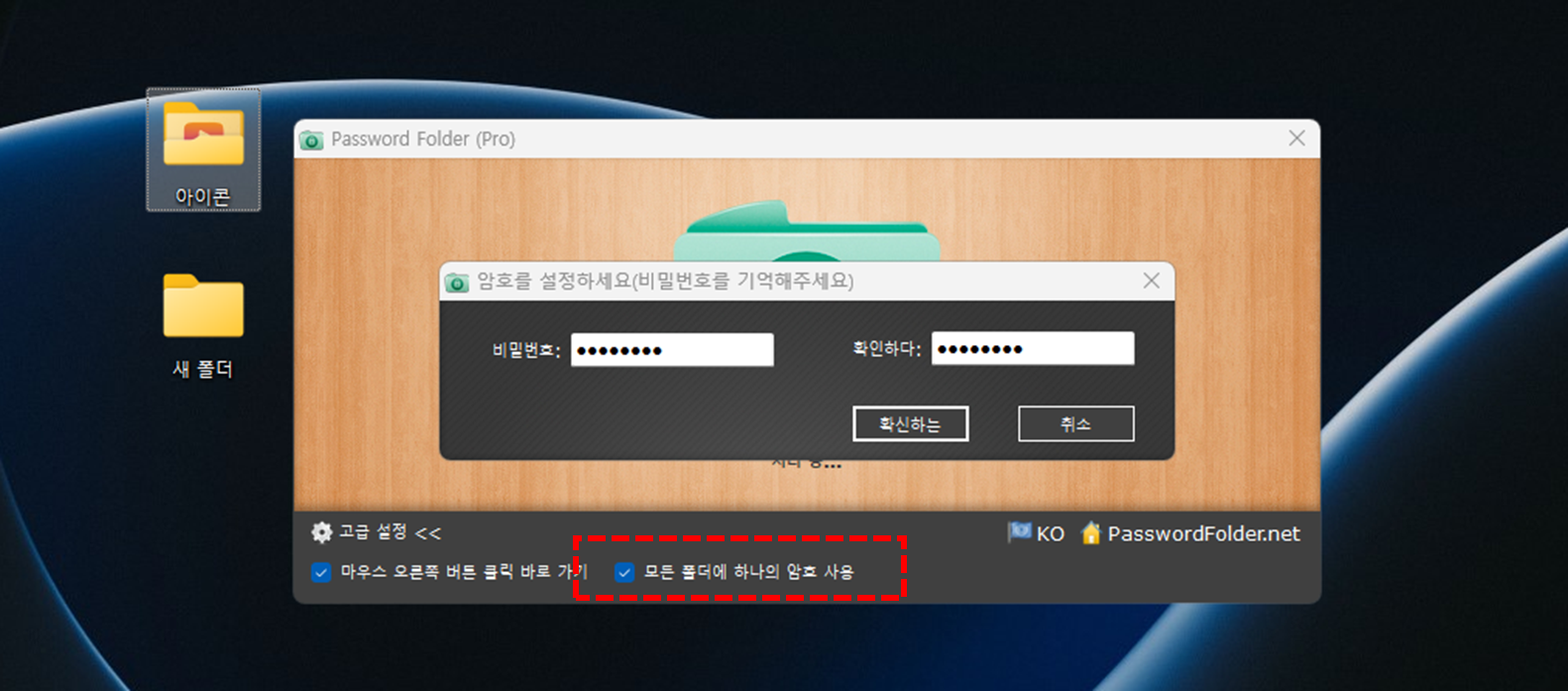 1️⃣ 모든 폴더에 하나의 암호 사용 기능을 활성화하면 최초 1회에 한해 아이콘 암호 생성 팝업창이 뜨게됩니다. 비밀번호 및 확인 비밀번호를 입력하고 아래쪽에 "확신하는" ( 번역이 잘못됨 ) 버튼을 클릭 합니다.