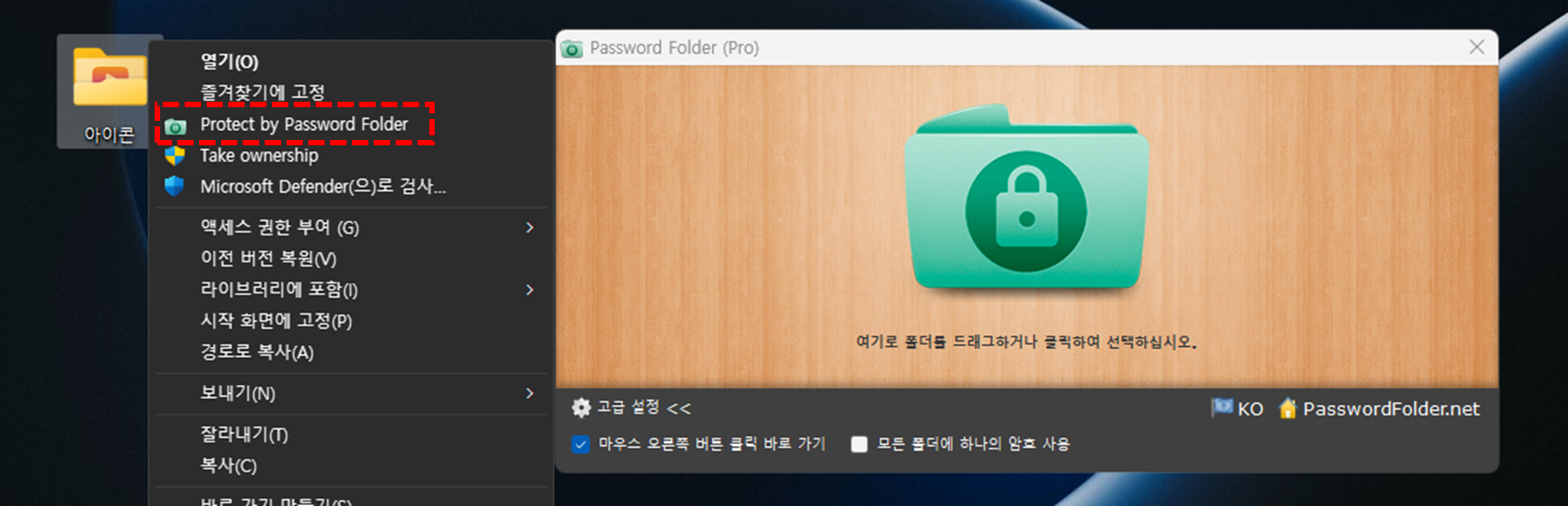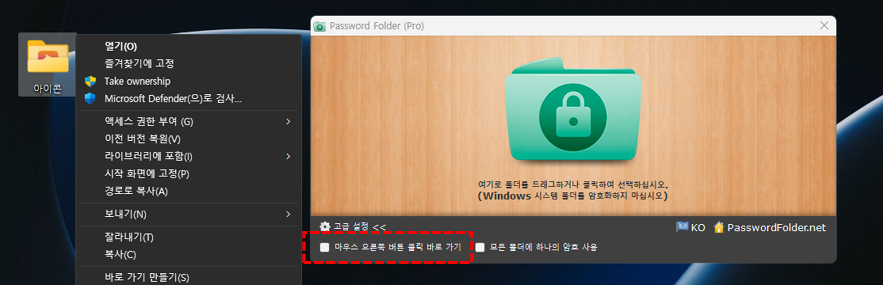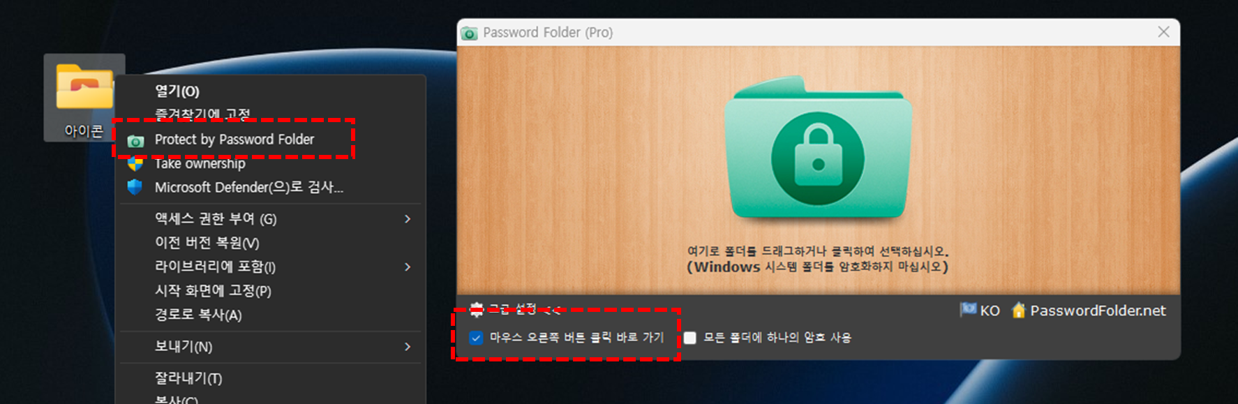1️⃣ 마우스 오른쪽 버튼 클릭 바로가기 옵션에 체크를 하면 암호를 걸어야 할 아이콘에 마우스 오른쪽 버튼을 클릭 했을 때 Password Folder 암호화 하기 컨텍스트 메뉴를 확인 할 수 있습니다. 프로그램이 실행되지 않더라도 이 컨텍스트 메뉴를 통해 간단하게 폴더를 암호화 할 수 있습니다.