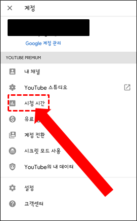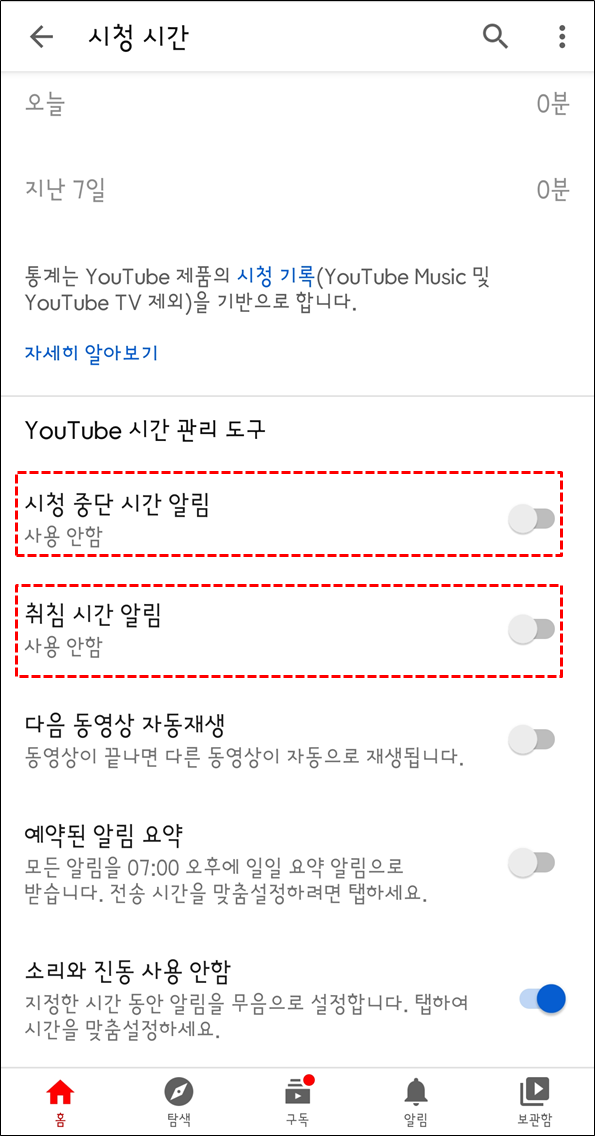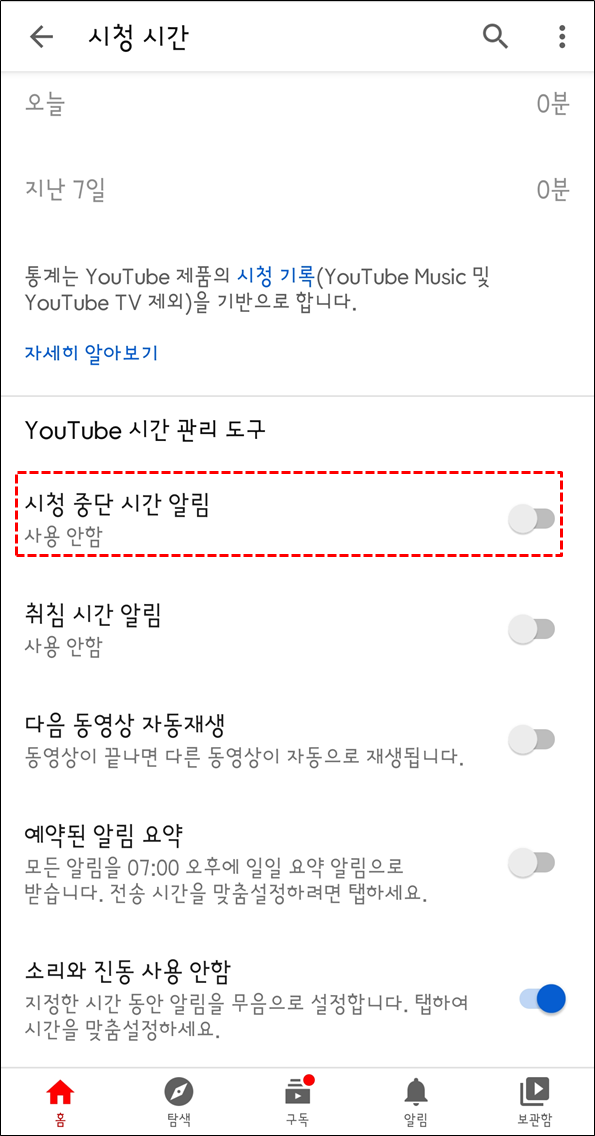 1. 유튜브 실행 후 우측 상단에 위치한 프로필 설정 선택 - 시청시간 메뉴 선택하게 되면 시청 중단 시간 알림과 취침시간 알림 항목이 보입니다.