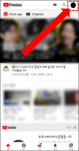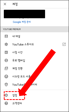 1. 유튜브 실행 후 우측 상단에 위치한 프로필 설정 선택 - 설정 메뉴 선택 합니다.