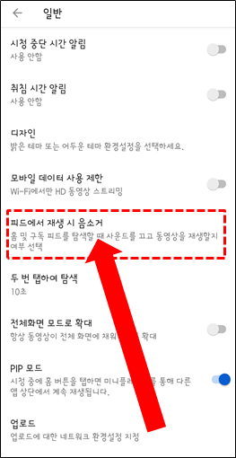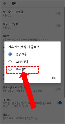 2. 피드에서 재생 시 음소거 항목을 선택 - 사용 안함 선택을 합니다.