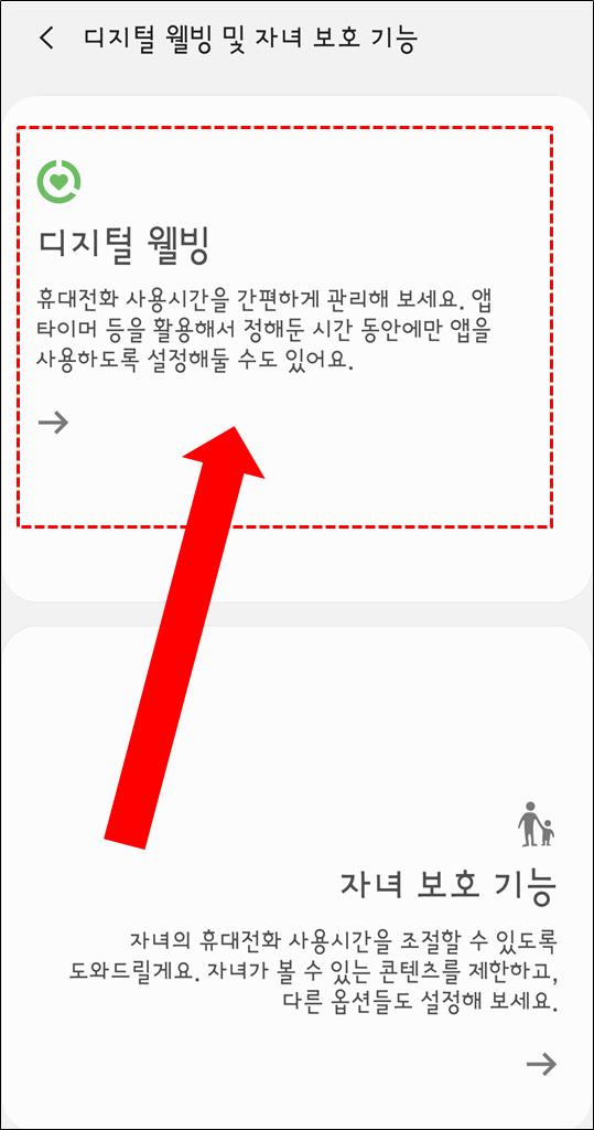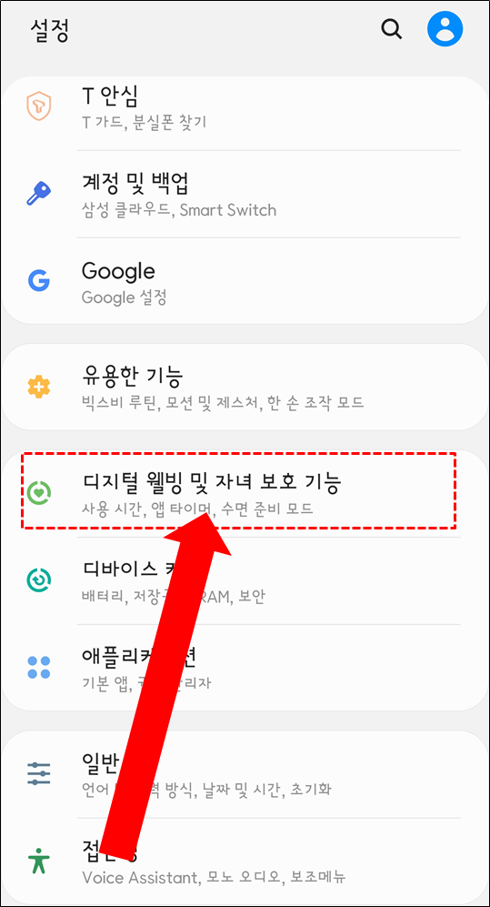 1. 스마트폰 설정 선택 - 디지털 웰빙 및 자녀 보호 기능 메뉴 선택 합니다.