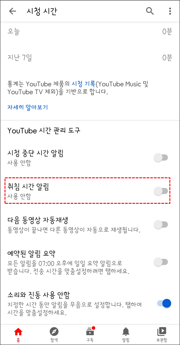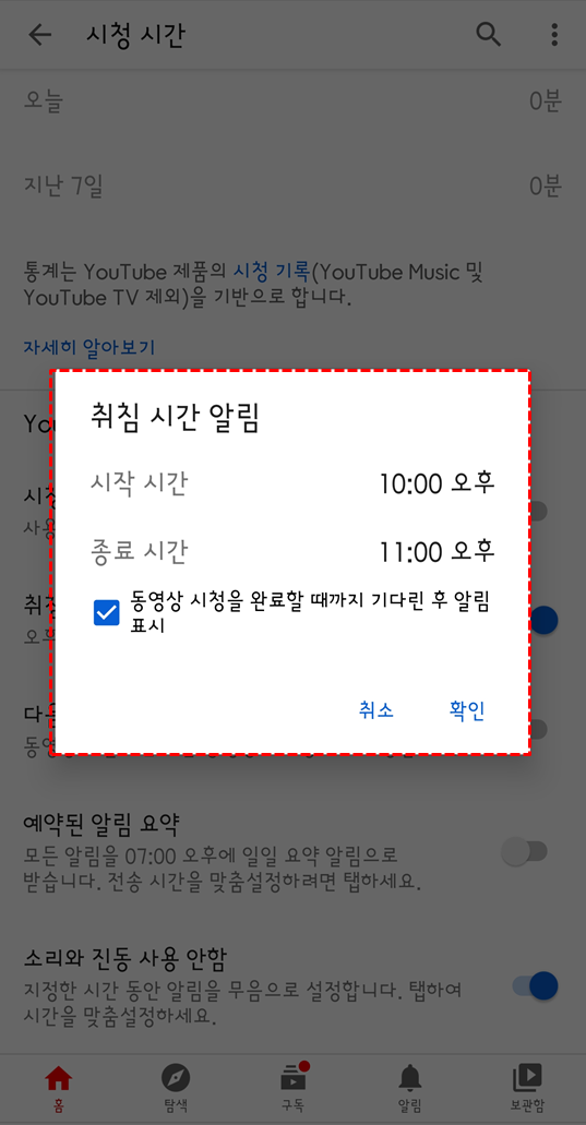3. 취심 시간 알림에 대해 알아보겠습니다. 이 설정은 내가 10시부터 11시까지 유튜브를 보고 잠을 잘거라고 설정을 해놓으면 11시가 되었을때 알림 메세지가 뜨게 됩니다. 시청 중단 시간 알림과 마찬가지로 예약종료는 아니고 알림메세지가 뜨며 본인이 그대로 잠들었다면 스마트폰이 자동 종료가 됩니다.