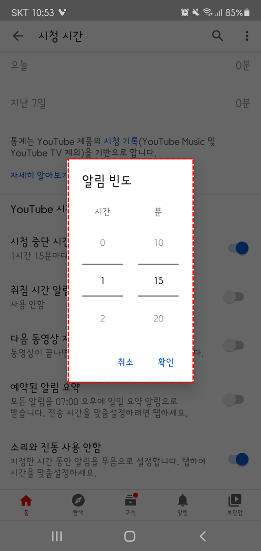 2. 먼저 시청 중단 시간 알림 메뉴에 대해 알아보겠습니다. 이 기능은 사용자가 지정한 시간만큼 유튜브를 보게되면 알림메세지가 뜨는 기능입니다. 알림이 떴을때 내가 잠을 자고 있어 스마트폰이 아무것도 실행이 되지 않게 되면 알림메뉴가 떠있는 상태로 내 휴대폰이 꺼지게 됩니다.