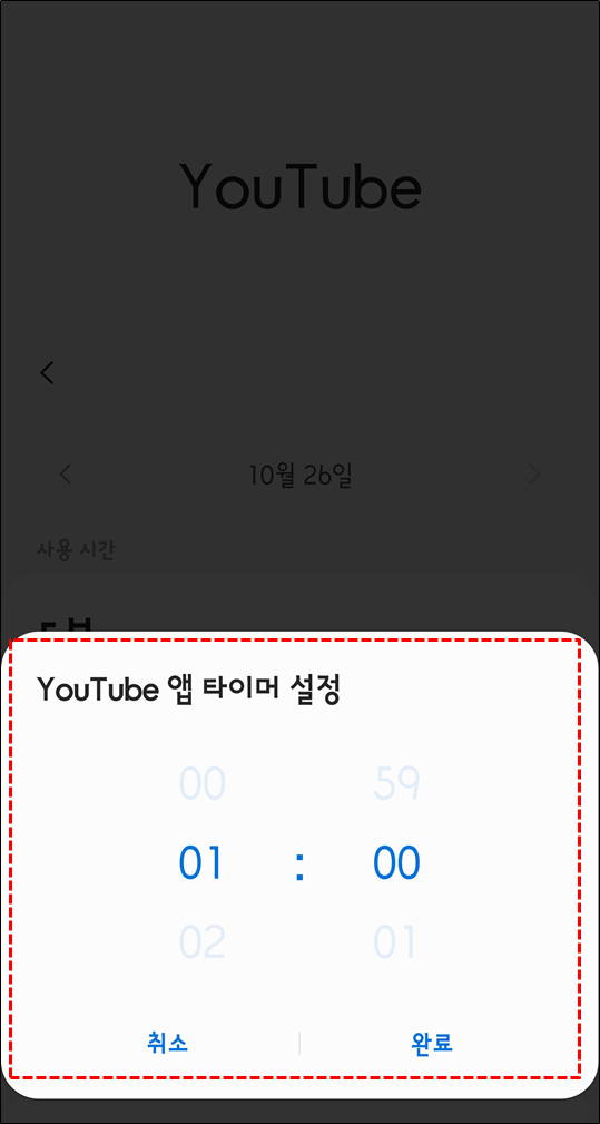 4. 유튜브 영상을 지금부터 1시간 정도 본 후 자동 종료하게 설정하시려면 앱타이머를 1시간에 맞춰 놓으시면 됩니다.