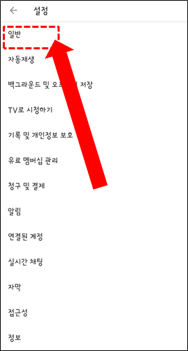 1. 유튜브 실행 후 우측 상단에 위치한 프로필 설정 선택 - 설정 메뉴 선택 - 일반 메뉴 선택 합니다.