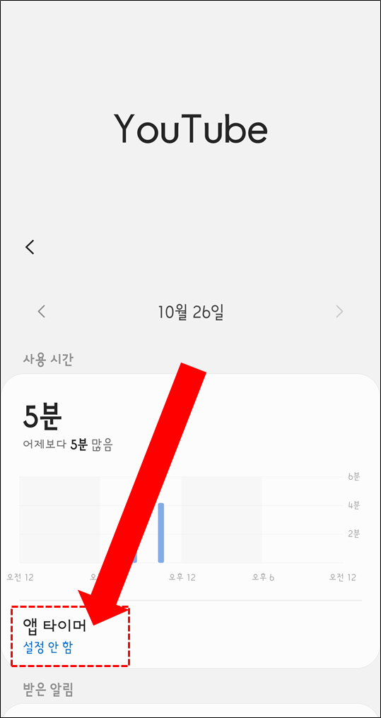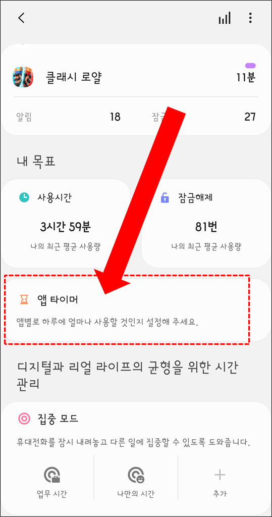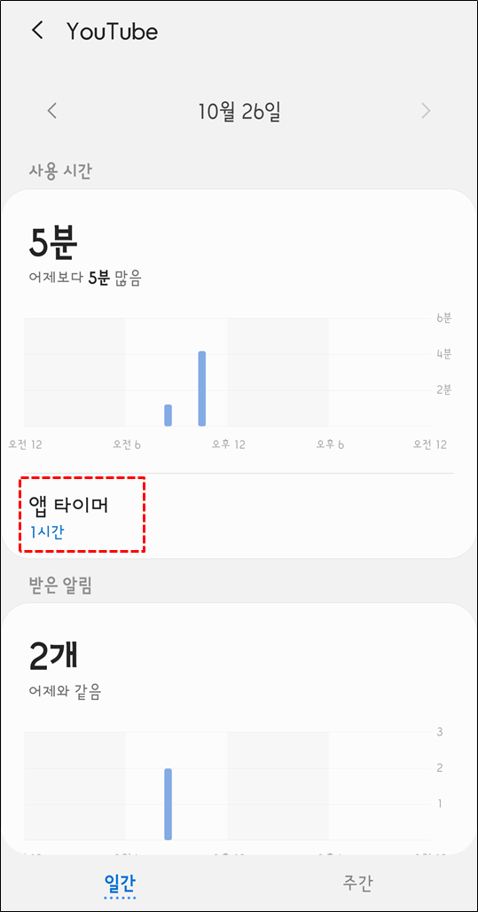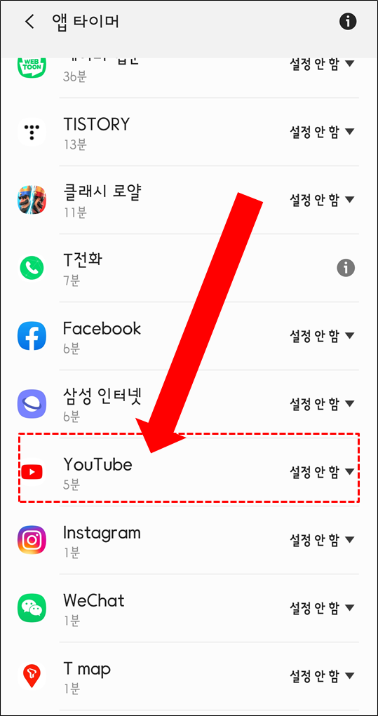 2. 디지털 웰빙 메뉴 선택 - 앱 타이머 항목 선택 - 유튜브 앱을 선택 합니다.