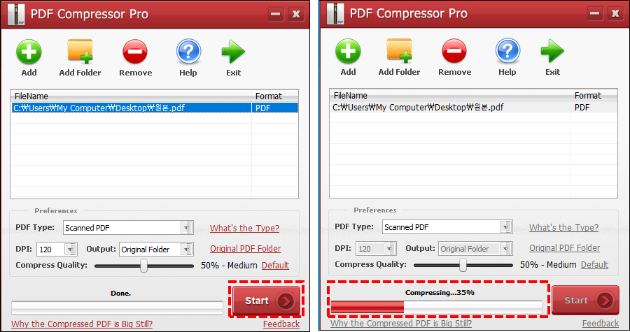 3. 프로그램에 PDF 파일이 추가되면 우측하단에 Start 버튼을 클릭합니다. 대용량 PDF파일의 압축이 진행됩니다.